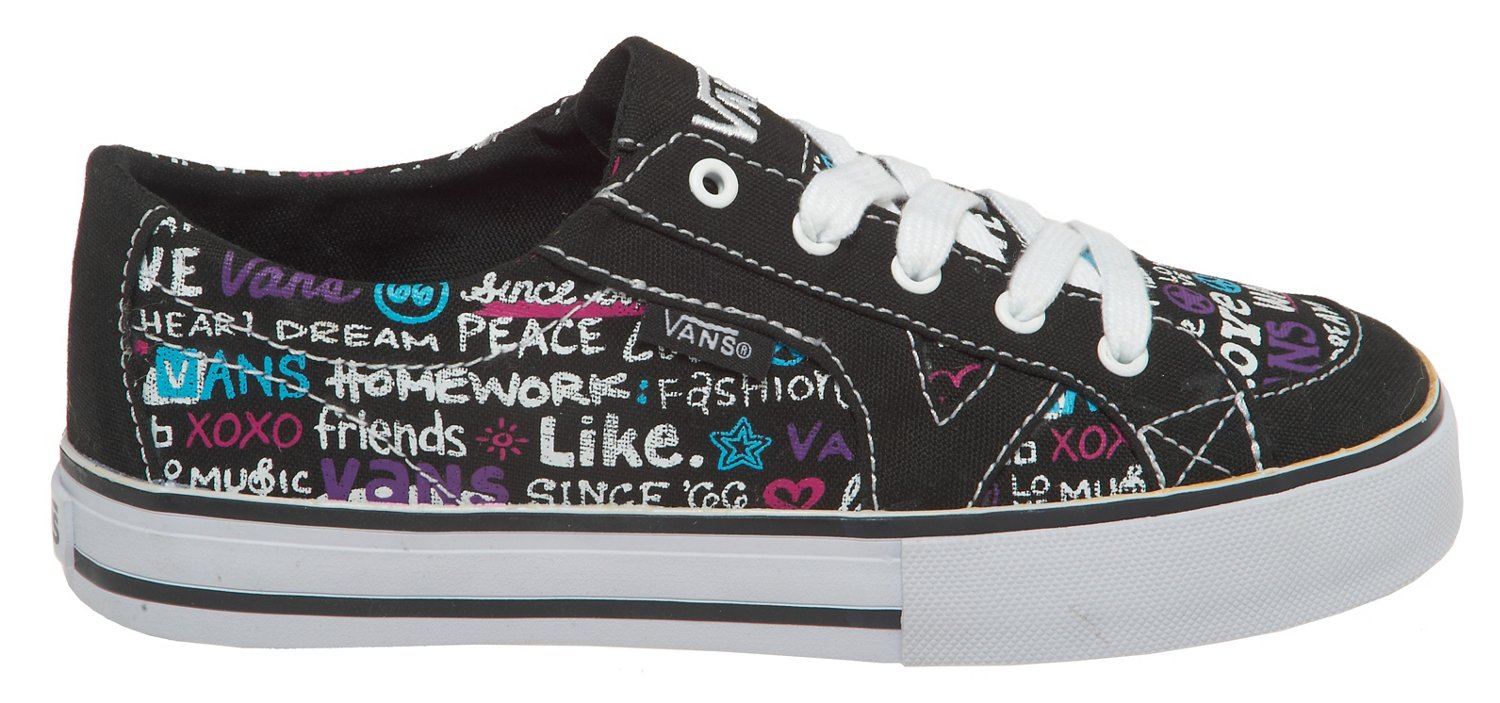 The Vans Boys' Tory Sneakers are made with durable canvas and suede uppers and low-profile, microwaffle vulcanized rubber outsoles that offer traction on a variety of surfaces. The sneakers are decorated with multicolored hearts, stars and fun phrases plus a flying V logo to provide a cool look she'll love.