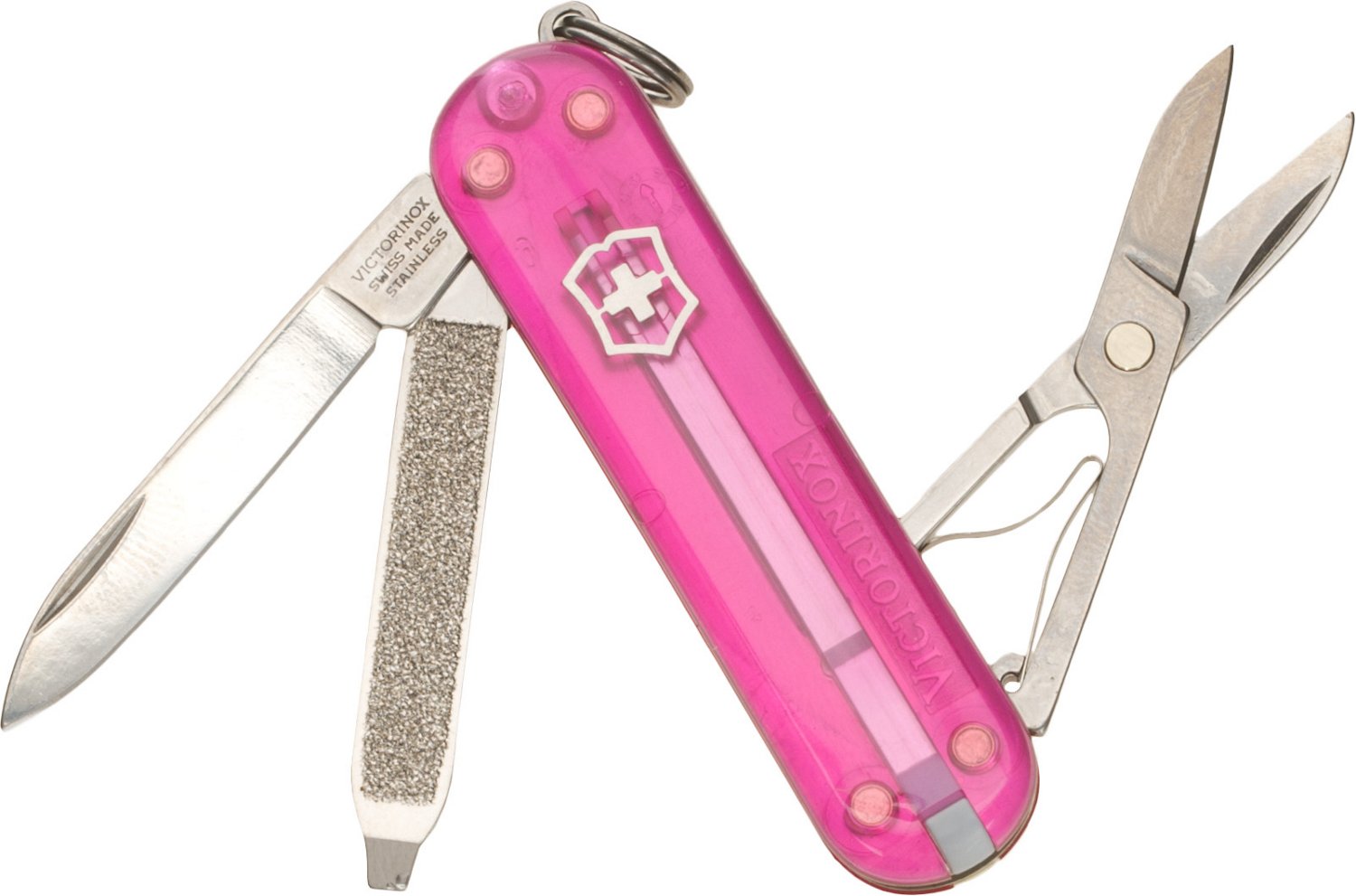 Great for everyday, versatile use, the Victorinox Classic SC Swiss Army Multi-Tool is made of stainless steel for durability with a polished, translucent pink Cellidor® handle and rustproof aluminum alloy separators. The multi-tool features a straight-edge blade, scissors, tweezers, a toothpick and a nail file with a screwdriver. 0.8 oz. 2.28" overall length.