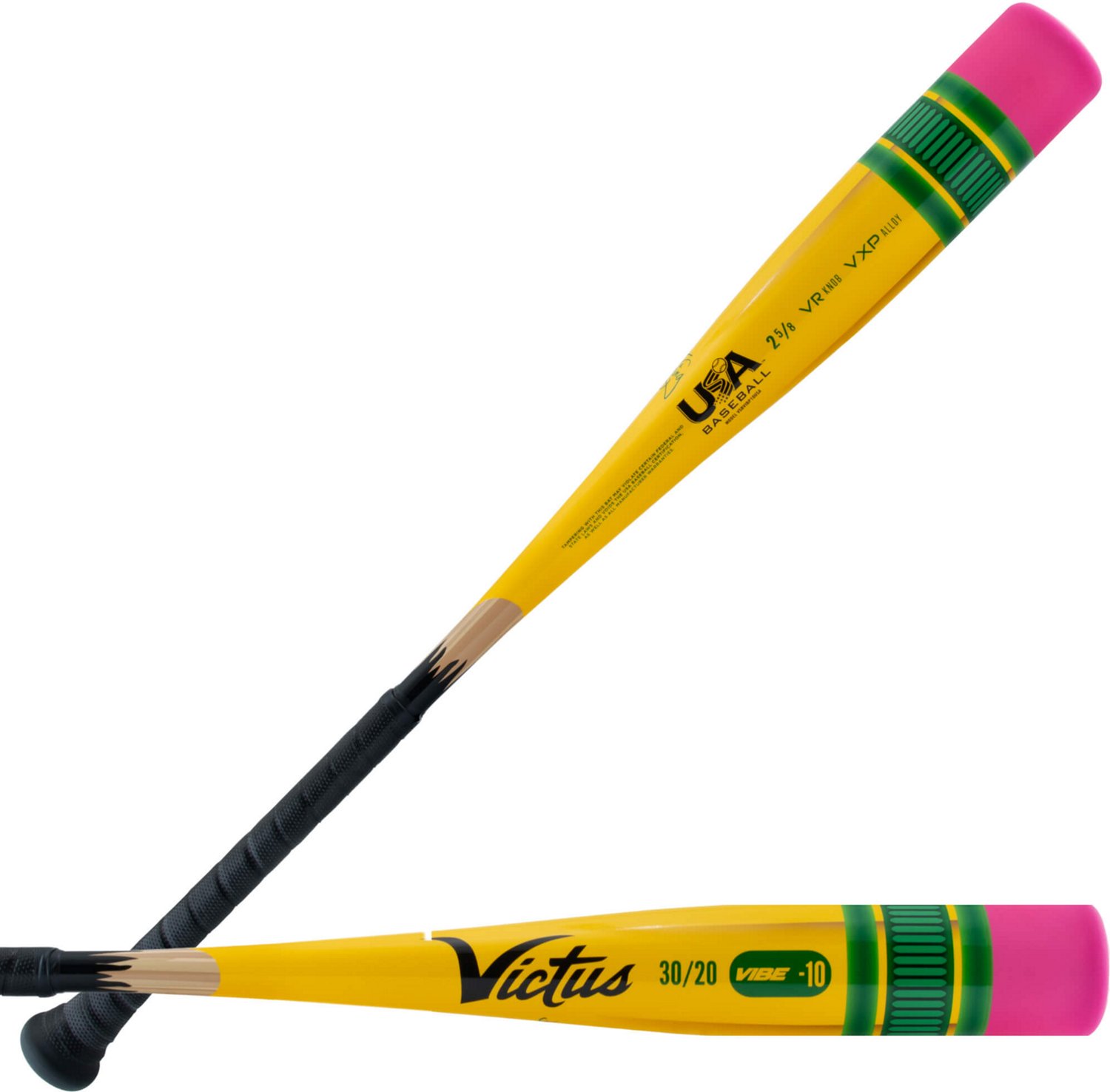 Step to the plate in style when wielding the Victus Sports Vibe Pencil USA Baseball Bat -10. This single-piece aluminum bat is made from VPX alloy for poppy performance. Its ringless barrel design provides an extended sweet spot, and the soft micro-perforated handle offers improved grip. Bold pencil-themed graphics add an eye-catching look.