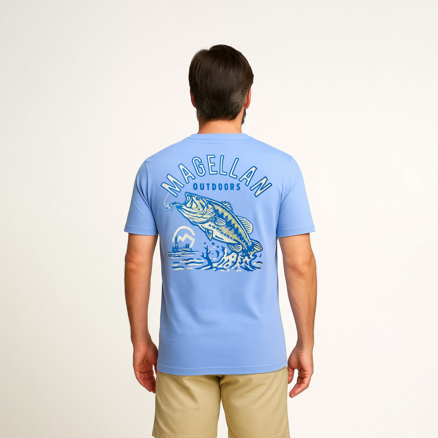 The Magellan Outdoors Men's Vintage Bass T-shirt is made of cotton and polyester and features a screen-printed graphic. Short sleeves. Machine wash cold.
