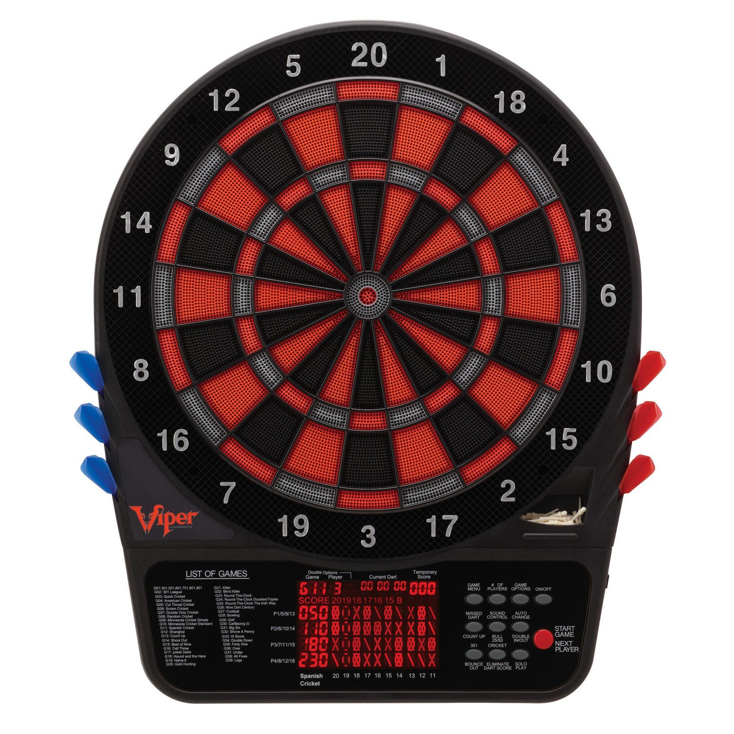 With an LED display for easy scorekeeping and navigation, the Viper 800 Electronic Dartboard offers 57 games with 307 options for up to 16 players to enjoy together. Quick-keys for 301 and cricket games enable easy access to the games, and built-in dart storage along the sides and a catch ring help keep darts contained. Includes 6 darts, 24 spare tips, an AC adapter and mounting hardware.
