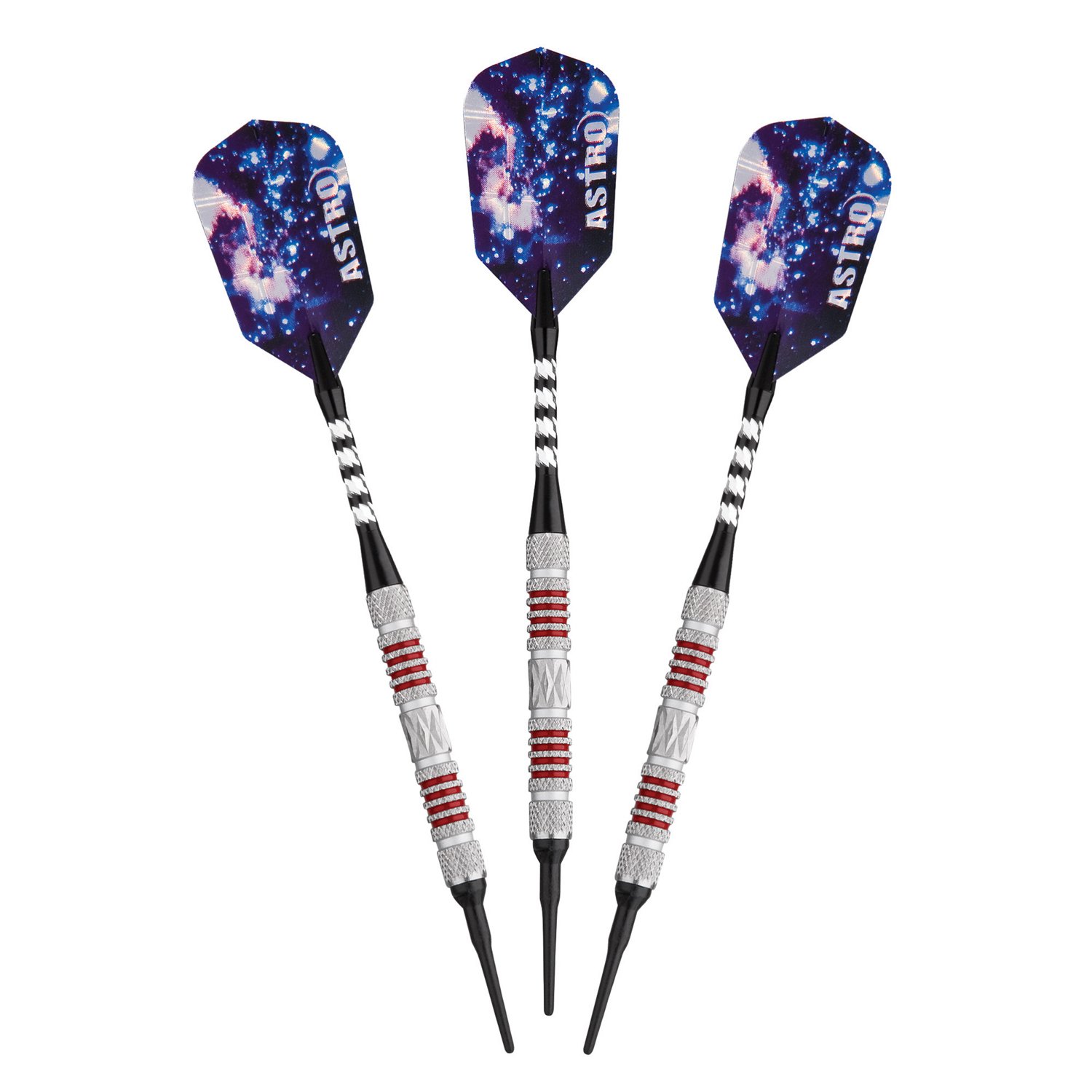 Hand painted for a sleek look, the Viper Astro 18-Gram Soft-Tip Darts 3-Pack feature 2-way, diamond-cut tungsten barrels and diamond-cut aluminum shafts for durability and light weight. Strategically placed grooves and knurling suit a wide range of players. Viper Knight storage case. 2BA tips. Includes 2 sets of flights.