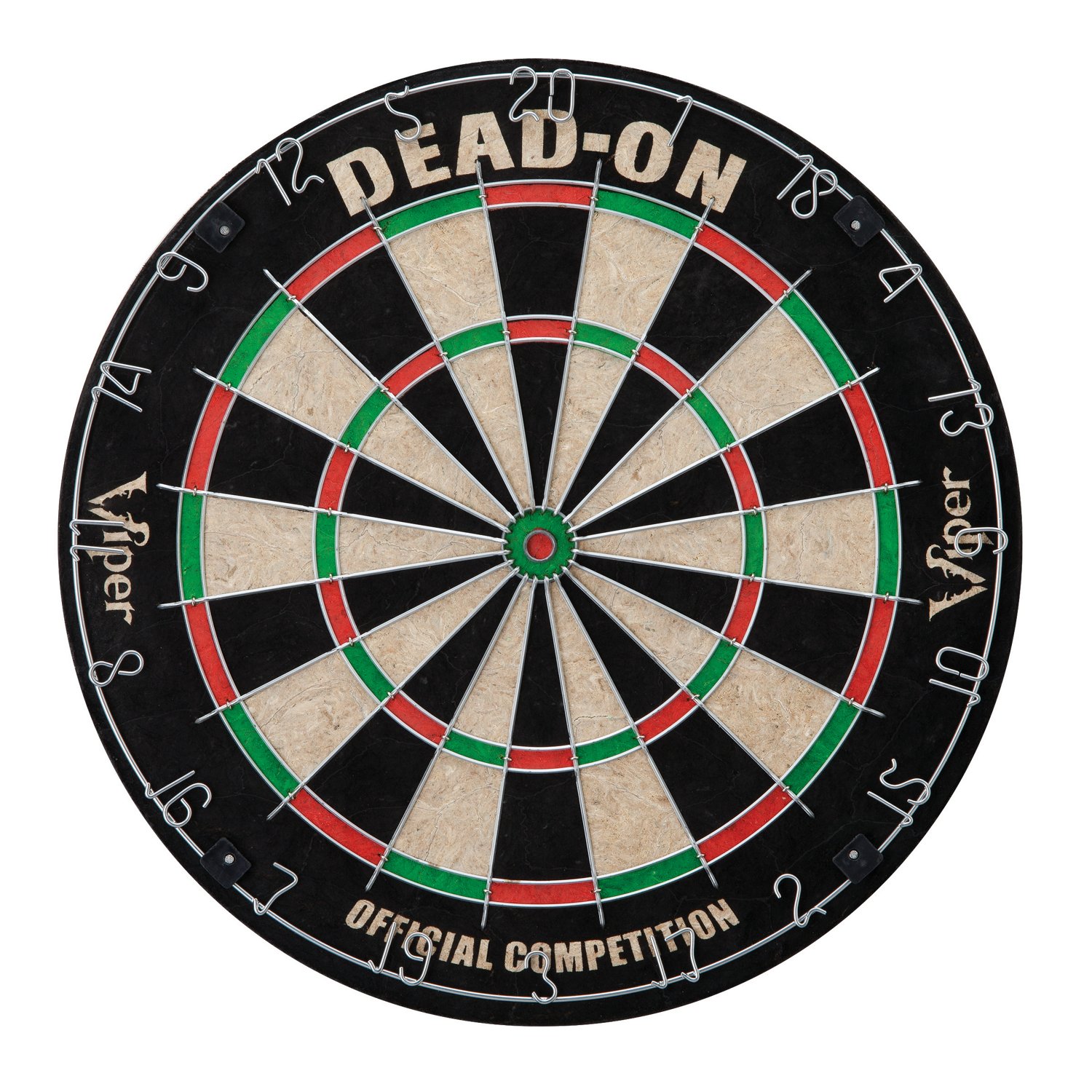 Designed for use with both steel-tip and soft-tip darts, the Viper Dead-On Bristle Dartboard features triangular-shaped wires and a staple-free bull's-eye to help prevent bounce-outs. The self-healing board enables long-lasting use, and the removable number ring is low glare for easy visibility. Includes wall mounting hardware.