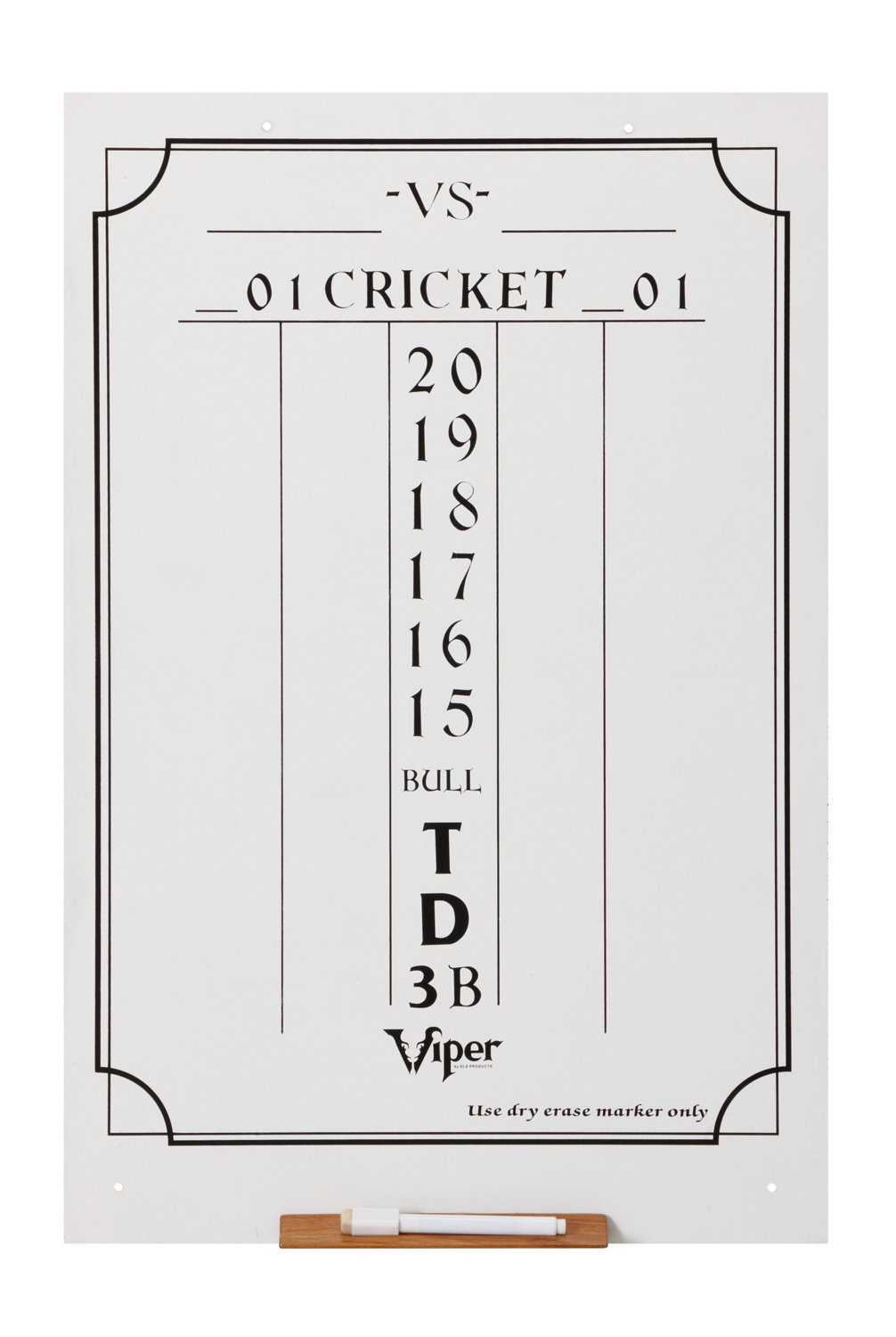 Keep tabs on the winner of your cricket game with the Viper Large Cricket Dry-Erase Scoreboard. Preprinted for easy points tracking, the dry-erase surface is easy to clean for mess-free scorekeeping and has a built-in shelf for your marker (included). Comes with mounting hardware.