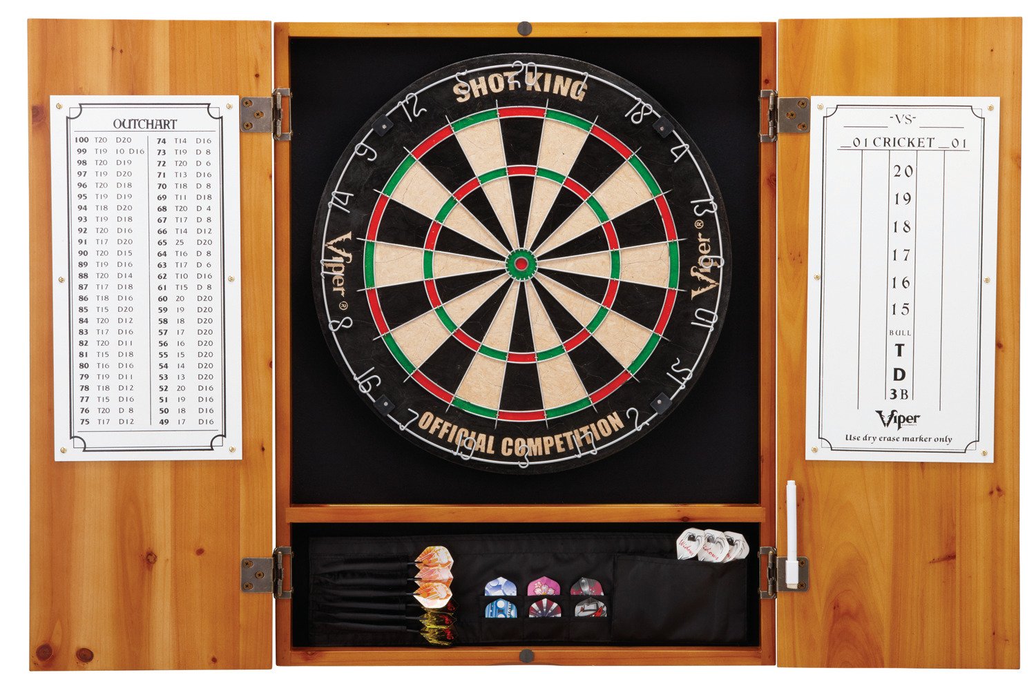 Compatible with most steel-tip dartboards, the Viper Metropolitan Dartboard Cabinet features a high-profile design with 2 cabinet doors and a removable dart and accessory holder. Solid wood construction with self-closing hinges.