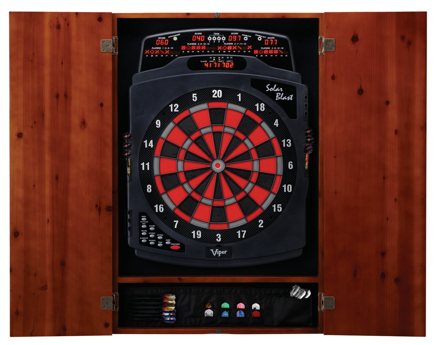 Compatible with most soft-tip dartboards, the Viper Metropolitan Dartboard Cabinet features a high-profile design with 2 cabinet doors and a removable dart and accessory holder. Solid oak construction with self-closing hinges.