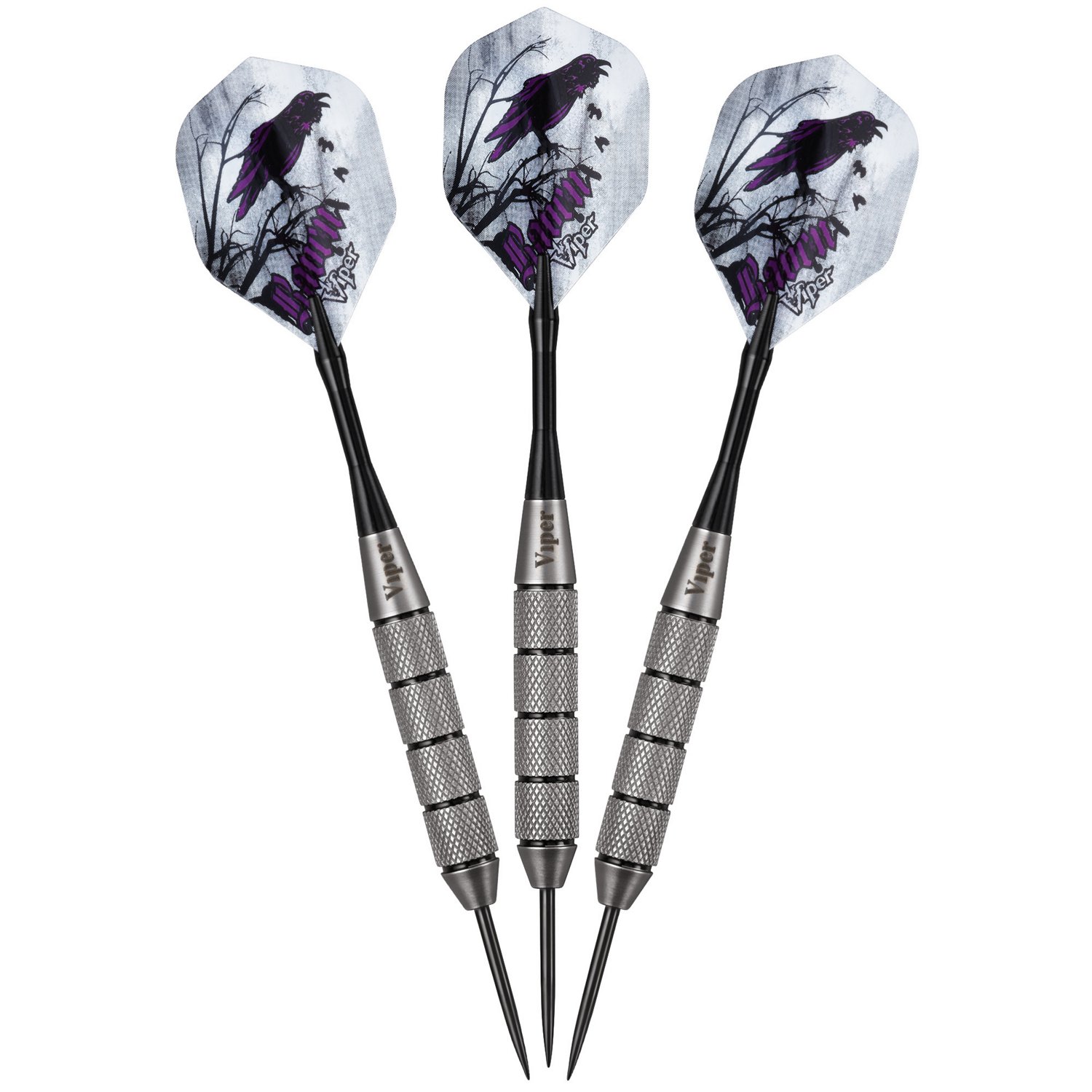 Play with the Viper Underground Raven 25-Gram Steel-Tip Darts 3-Pack on league night at your favorite hangout. The knurled barrels with a tungsten-like coating offer a sturdy, comfortable grip, and the flight graphics provide a cool look. Steel tips. 25 grams.