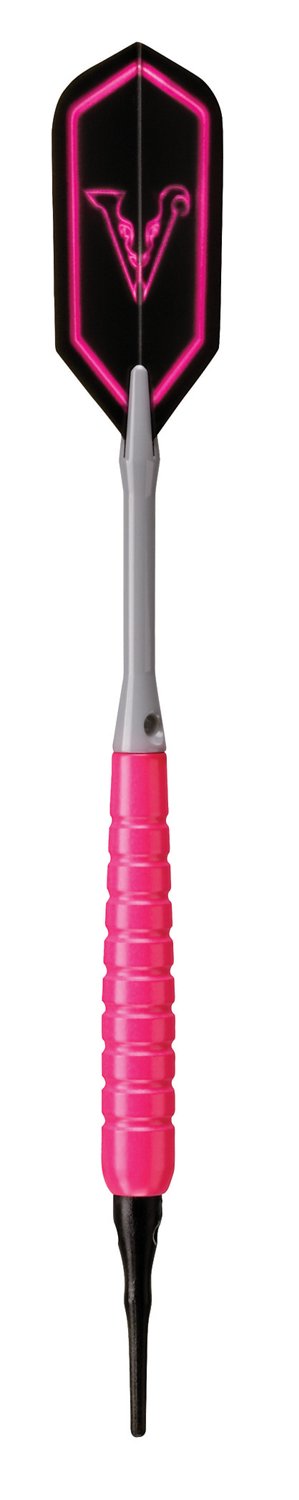 Streak ahead of your competition with the Viper V Glo 18-Gram Soft-Tip Darts Set, which includes translucent V Glo flights that flash neon in the light. Designed with bright colors, the darts feature grooved, front-weighted barrels for optimal performance and aluminum shafts with locking holes. 2BA Tufflex soft tips. Includes 3 barrels, 3 shafts, 3 flights and 3 tips.