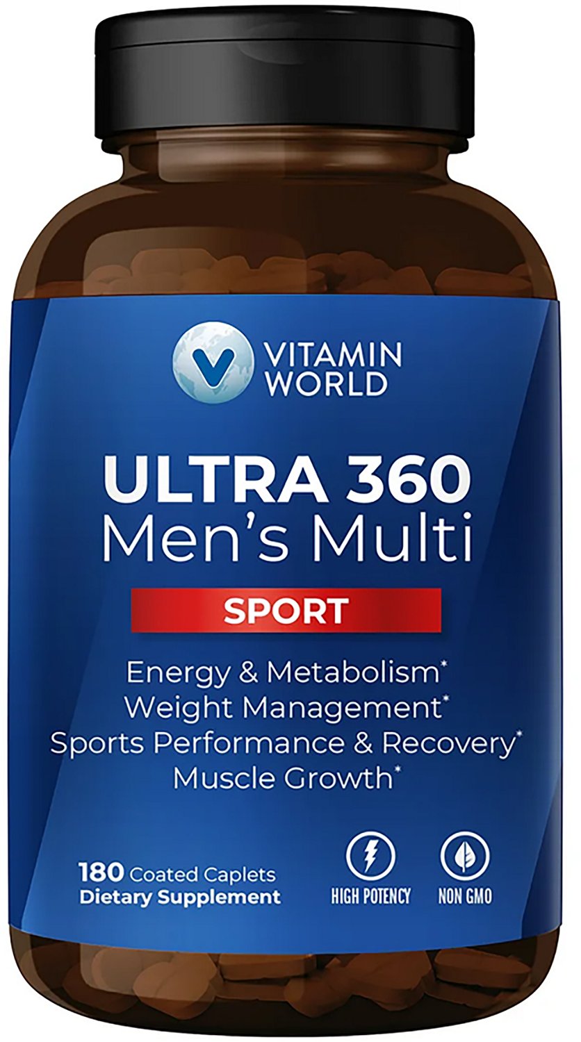 Support your health with the Vitamin World ULTRA 360 Men's Multivitamin Sport 180-count. It supports daily energy and metabolism. The multivitamin aids with weight management, and it offers nutrition support for sports performance and recovery. The coated caplets offers simple consumption.