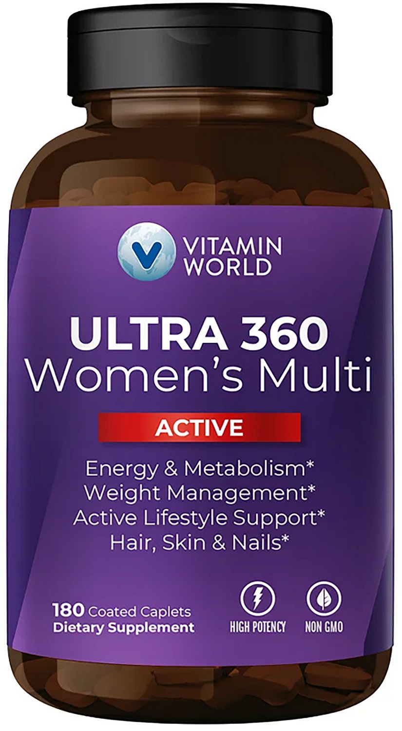 Support your health with the Vitamin World ULTRA 360 Women's Multivitamin Active 180-count. It supports energy and metabolism. The multivitamin aids in weight management, and it supports an active lifestyle with faster recovery from exercise. The multivitamin promotes glowing skin, joint and bone health.