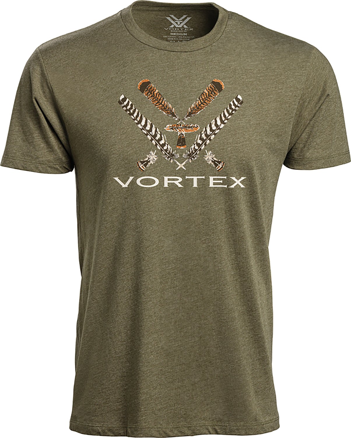 Show off your love of the hunt in the Vortex Men's Turkey Feather Core Logo Short Sleeve T-shirt. It is made of 52% cotton and 48% polyester for comfort and durability, and the turkey feathers graphic with a Vortex® logo adds a touch of style.
