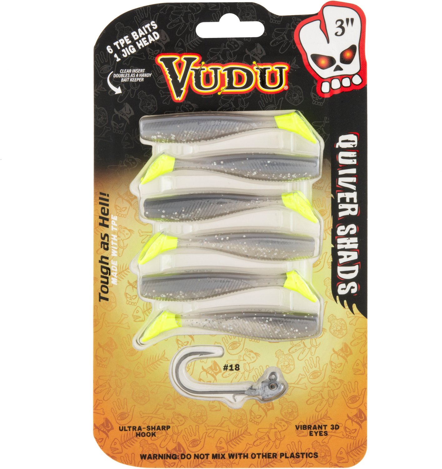 The Vudu Quiver Shad 6-Pack is great when fishing for Trout, Reds, Flounder, Snook and Tarpon. The "Tough As Hell" TPE construction remains strong bite after bite, and the wide body and tapered boot tail creates quivering movements as you retrieve to entice fish to take a bite. The Vudu head jig makes the hassle of rigging TPE baits no longer, and the bait also shakes and wobbles to mimic the movements of real baitfish swimming.