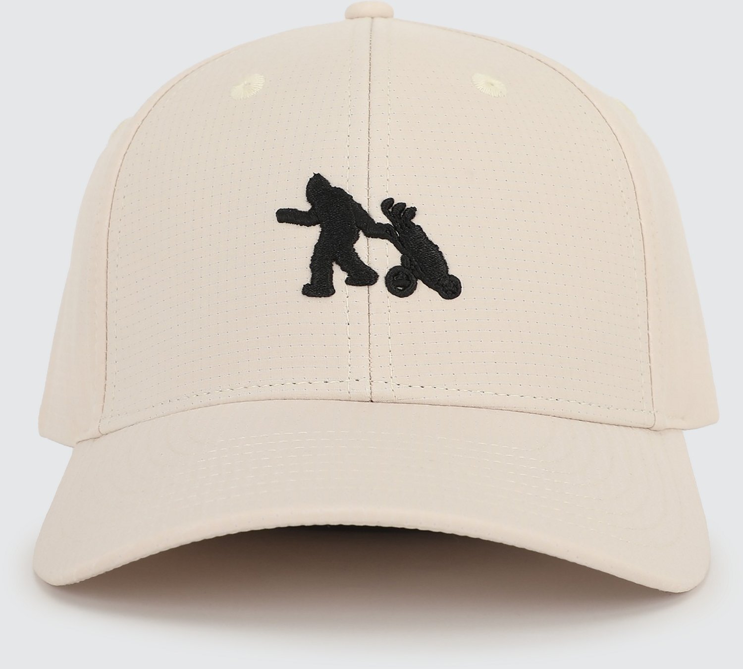 Look your best with the Waggle Men's Find Me Rollin' Performance Dad Hat. It is made of 95% polyester and 5% spandex. The ventilated material enhances breathability, and the hat is styled for performance. The sasquatch pulling a golf bag graphic shows off your unique style.