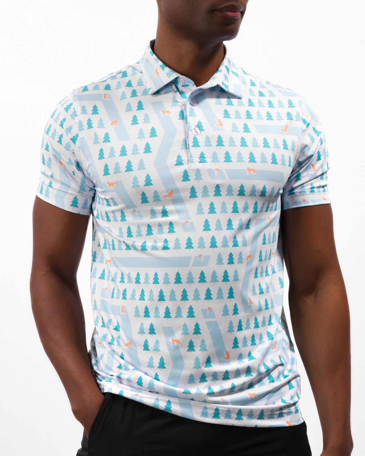 Look your best in the Waggle Men's Fox Holes Polo Shirt. It is made of 92% polyester and 8% spandex. The moisture wicking technology keeps you dry, and its collar neckline offers a sophisticated look. The small foxes and tree graphics add a quirky touch.