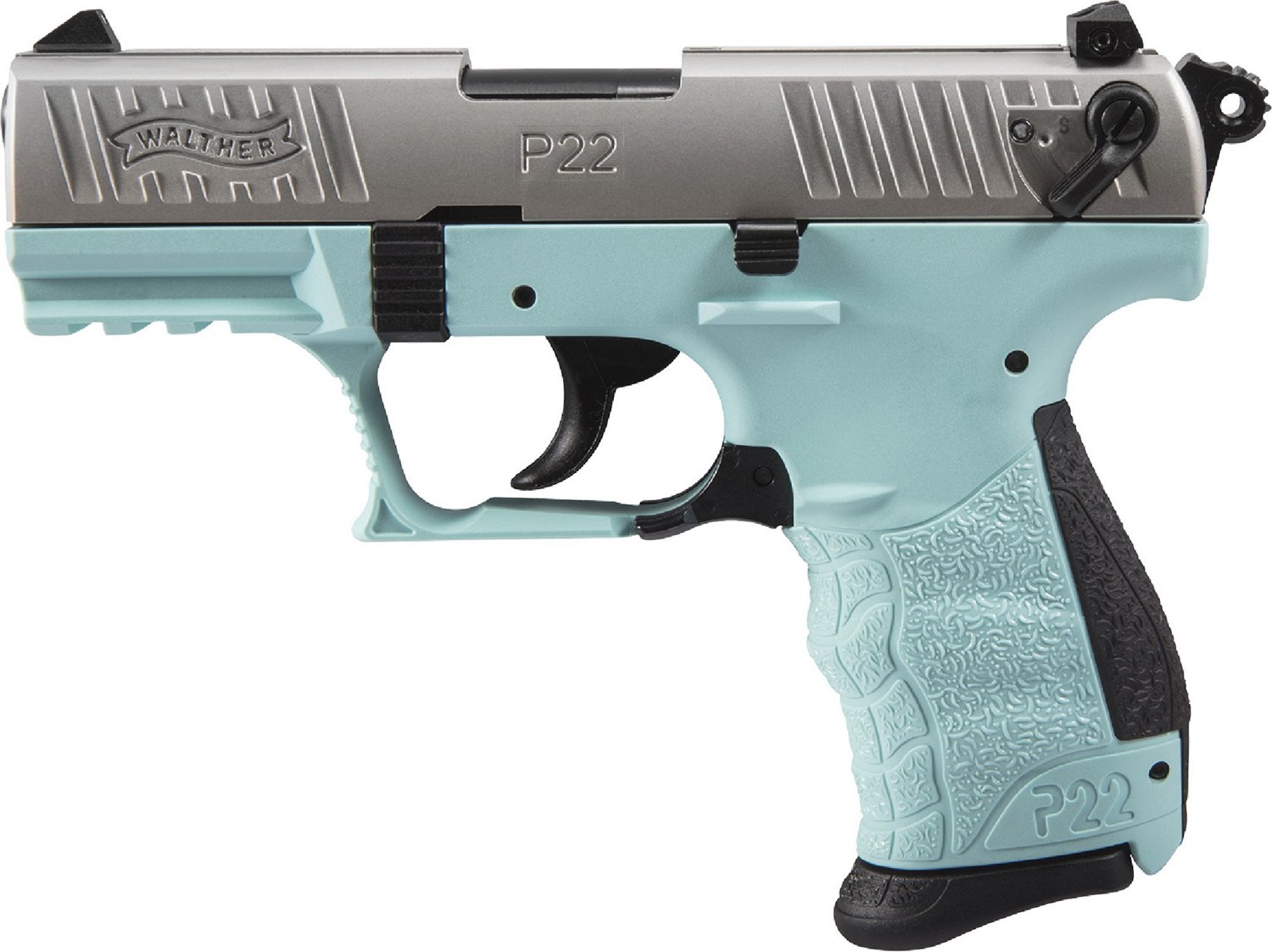 The Walther Arms P22 Q Angel Blue .22 LR Pistol with a nickel finish features a 3.42-inch threaded polymer barrel and an 11-pound single-action/double-action trigger. This rimfire pistol with a 10-round capacity has a windage-adjustable rear sight and an ambidextrous magazine release. Includes a manual and auto slide safety system and captured recoil spring.