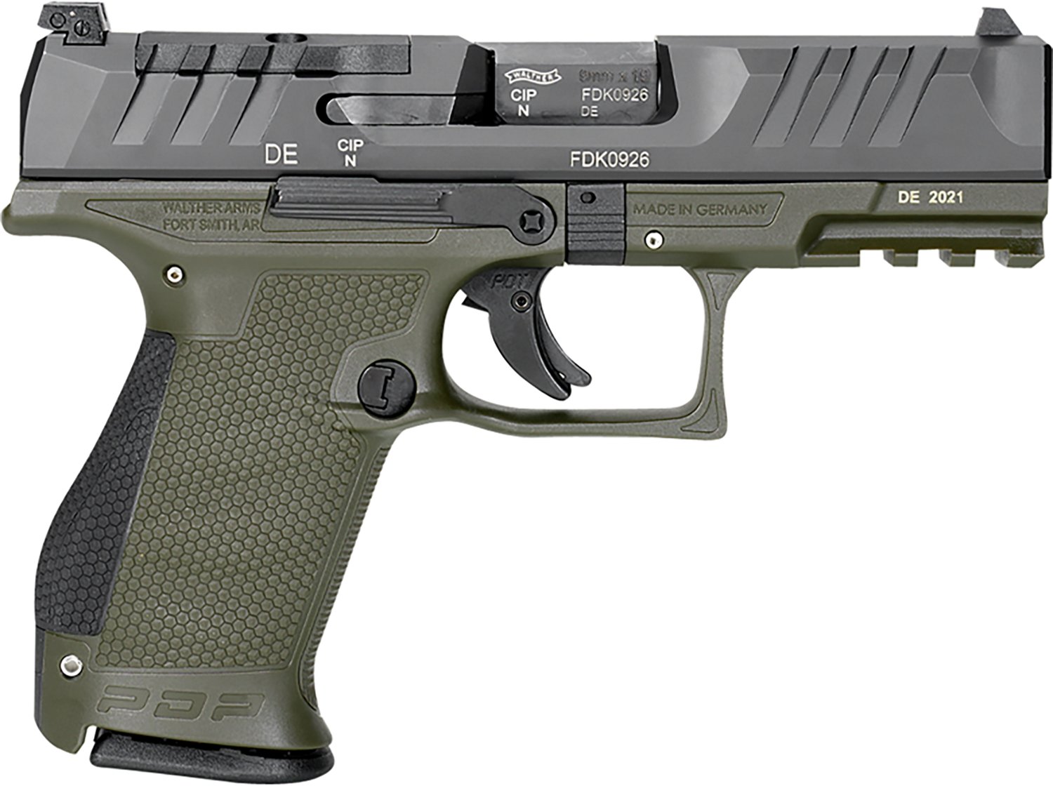 Arm yourself with the Walther PDP Compact 9mm Striker Fired Pistol. It is striker fired with a 15-round capacity. The steel barrel is 4-inches long, and its polymer frame has a picatinny rail. The black performance duty grip is textured.