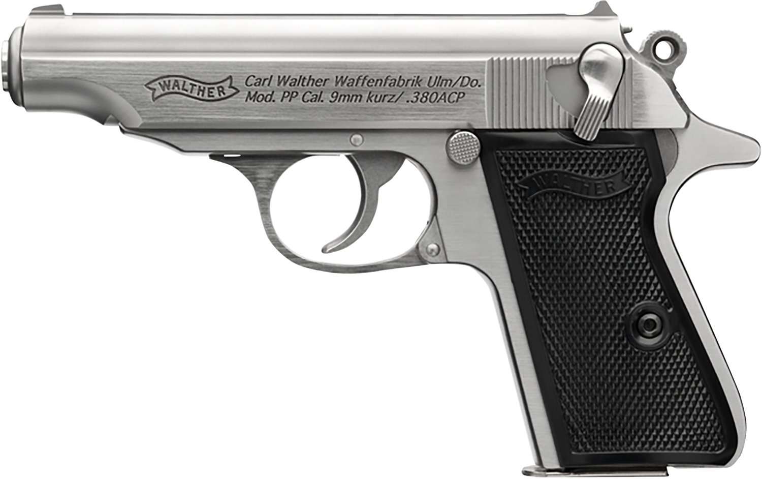 The Walther PP .32 ACP Pistol boasts single/double action and has an 8-round capacity. It's built with a steel frame and a plastic grip.