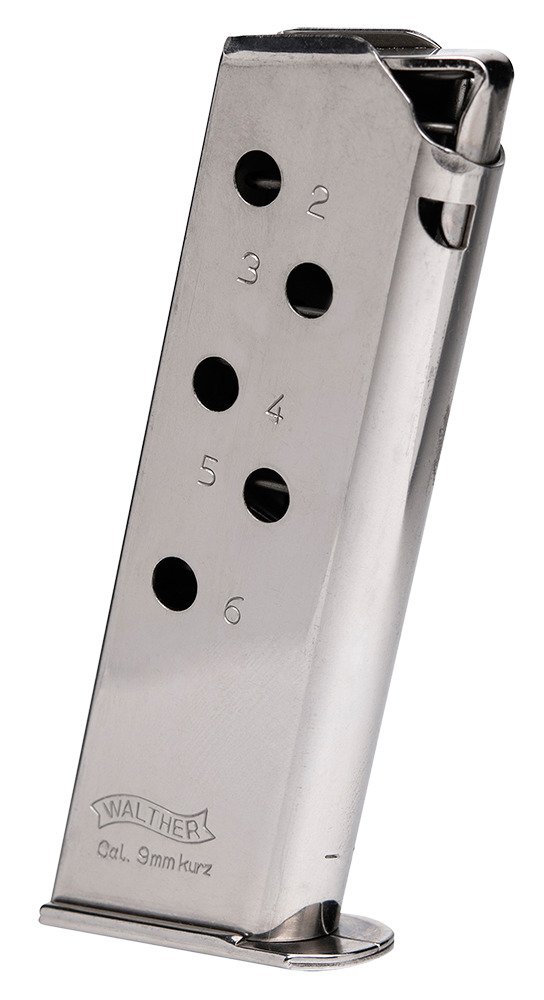 Make sure you're prepared by having the Walther PPK/S .380 ACP 7-Round Replacement Magazine. Made to fit your Walther PPK/S handgun, this magazine offers 7 rounds of .380 ACP caliber ammunition. Nickel finish. Detachable design.