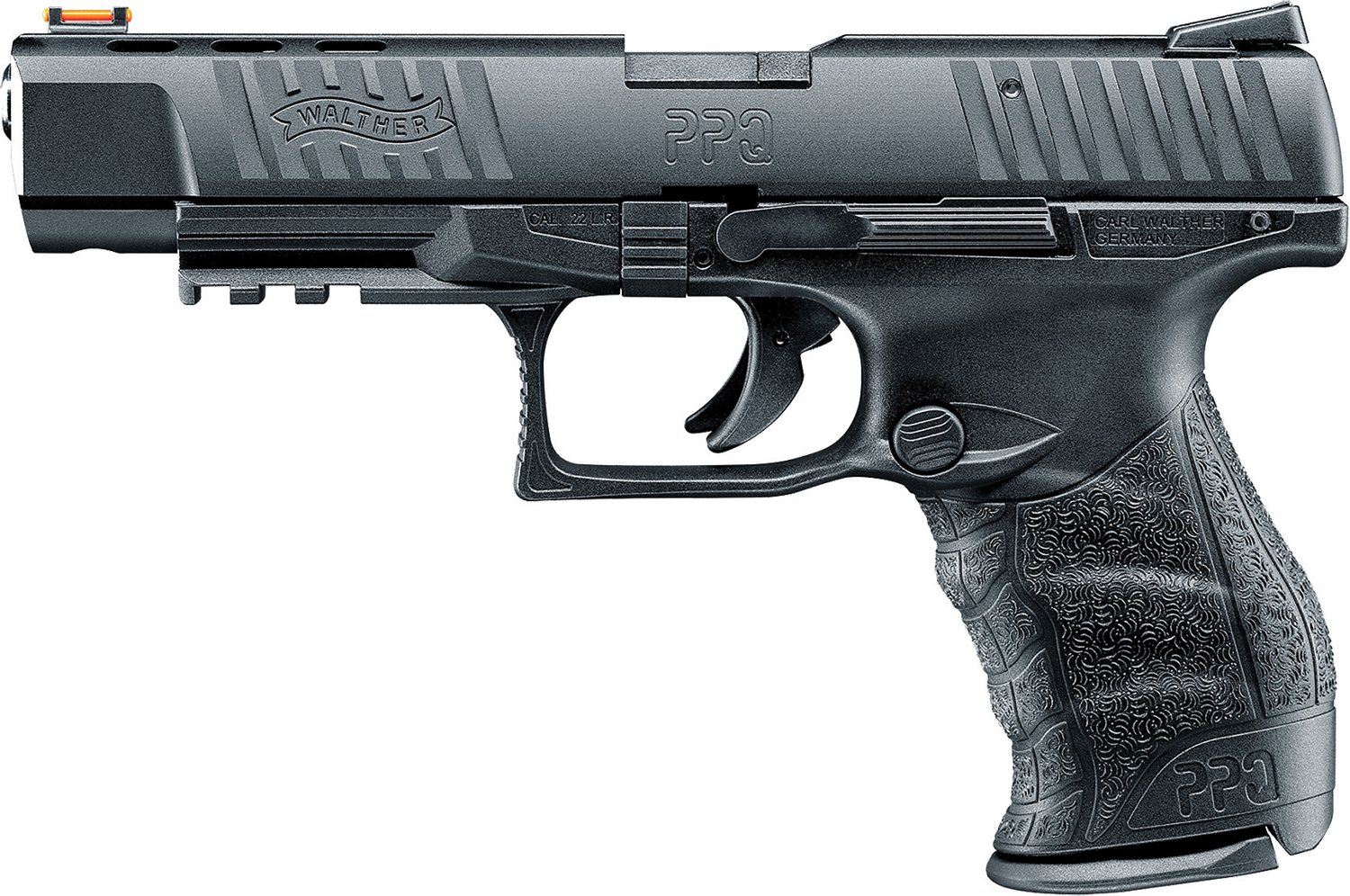 Topped with a fiber-optic sight on the front, the Walther PPQ M2 .22 LR Pistol features a nonslip slide with front and rear serrations and a 5-inch barrel that are coated in Tenifer. The cross-directional grip is ergonomically designed with interchangeable backstraps, and the MIL-STD-1913 Picatinny rail lets you mount accessories. Ambidextrous slide stop/magazine release.
