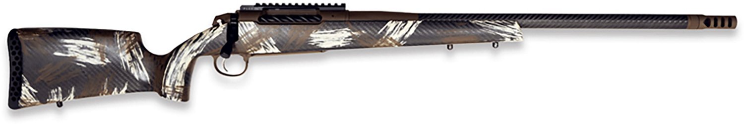 This Weatherby 307 Alpine CT .257 Weatherby Mag Bolt-Action Rifle features a carbon-fiber stock with a 24-inch threaded BSF carbon-fiber barrel with a Cerakote finish atop. It has a Peak 44 Picatinny rail and incorporates a directional self-timing brake.