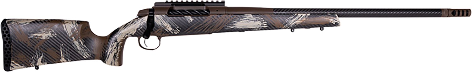 The Weatherby 307 Alpine CT .300 PRC Bolt Action Rifle is bolt action and has a 3+1-round capacity. It's built with a threaded carbon fiber barrel and a carbon fiber stock. A directional self-timing brake and a Peak 44 picatinny rail complete the design.