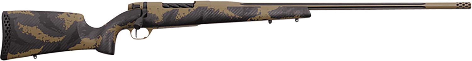 This Weatherby Mark V Apex .300 Weatherby Mag Bolt-Action Rifle is made for hunting, plus other shooting sports. Its 26-inch threaded barrel and receiver both have Cerakote finishes, and other features include a carbon-fiber stock, a TriggerTech trigger and an Accubrake ST muzzle brake.