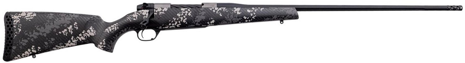 The Weatherby Mark V Backcountry TI 2.0 .240 Weatherby Magnum Bolt-Action Rifle has a 24-inch threaded barrel, a two-position bolt-mounted safety and a TriggerTech trigger. This firearm also features a 1-in-10 twist rate, a 5 + 1 capacity, a 3-D HEX recoil reducer and an Accubrake ST muzzle brake. Outfitted with a carbon fiber camo stock, this rifle also has an applied cerakote finish and a titanium receiver.