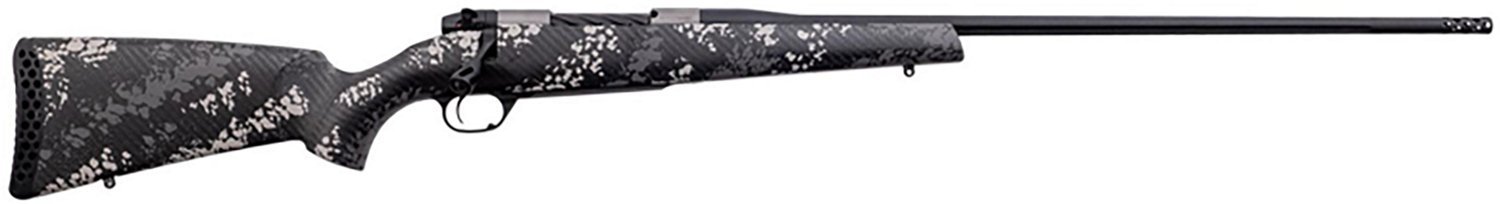 This Weatherby Mark V Backcountry Ti 2.0 7mm PRC Bolt-Action Rifle is made for hunting, plus other shooting sports. Its titanium receiver and TriggerTech trigger mount in a carbon-fiber stock with a 3D HEX recoil reducer, and its 24-inch, Cerakote-finish barrel features an Accubrake ST muzzle brake.
