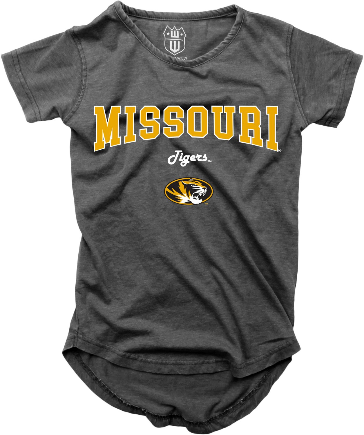 Root for your favorite team with the Wes and Willy Girls' University of Missouri Boatneck Burnout Graphic T-shirt. The cotton and polyester material provides a comfortable feel, while the graphic design shows off your Tigers pride.