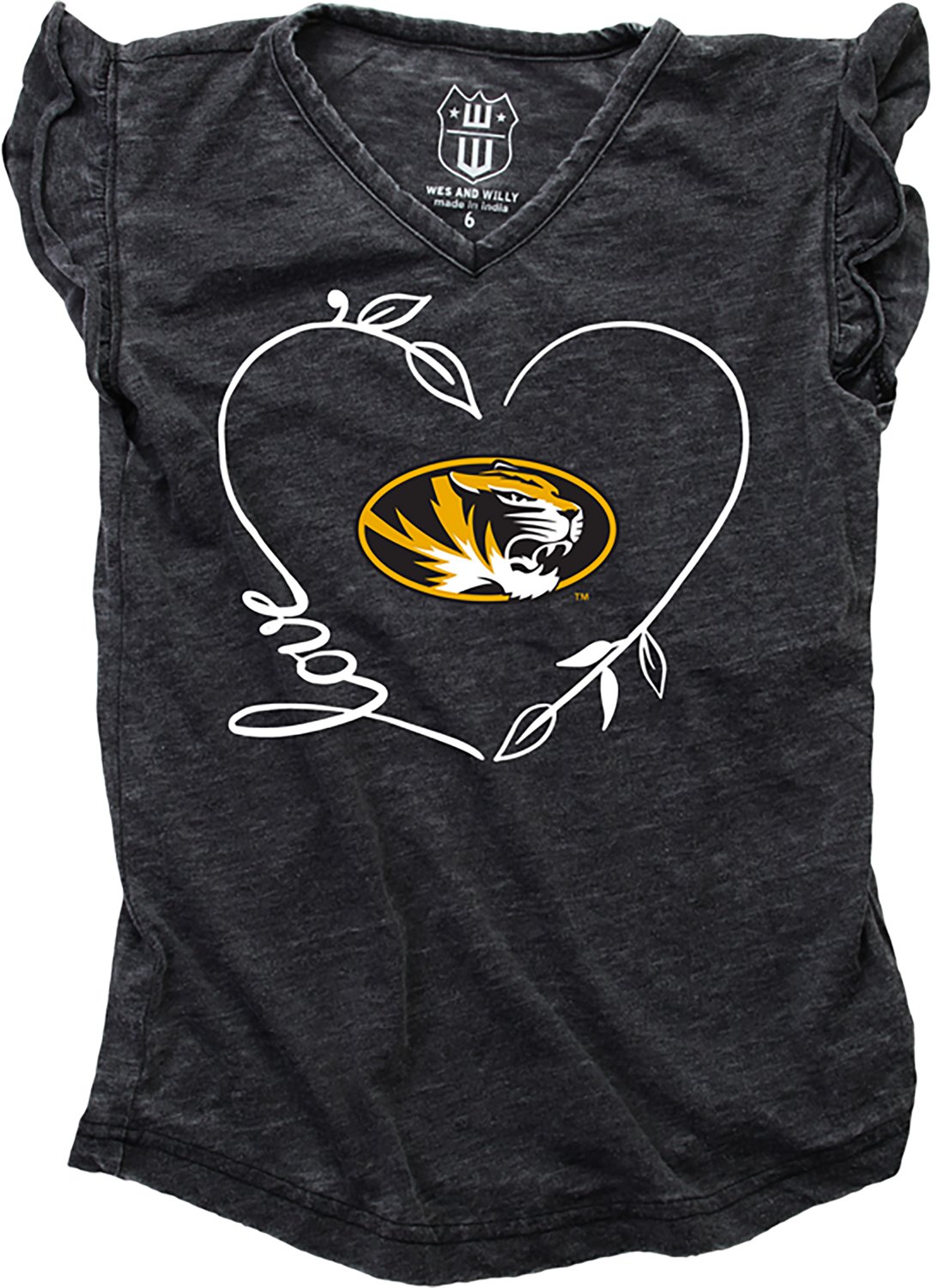Cheer on the Tigers while wearing the Wes and Willy Girls' University of Missouri Heart Ruffle Sleeve Burnout Tank Top. The cotton and polyester garment-washed fabric offers soft, comfortable wear, while the team graphic on the front showcases your fandom.