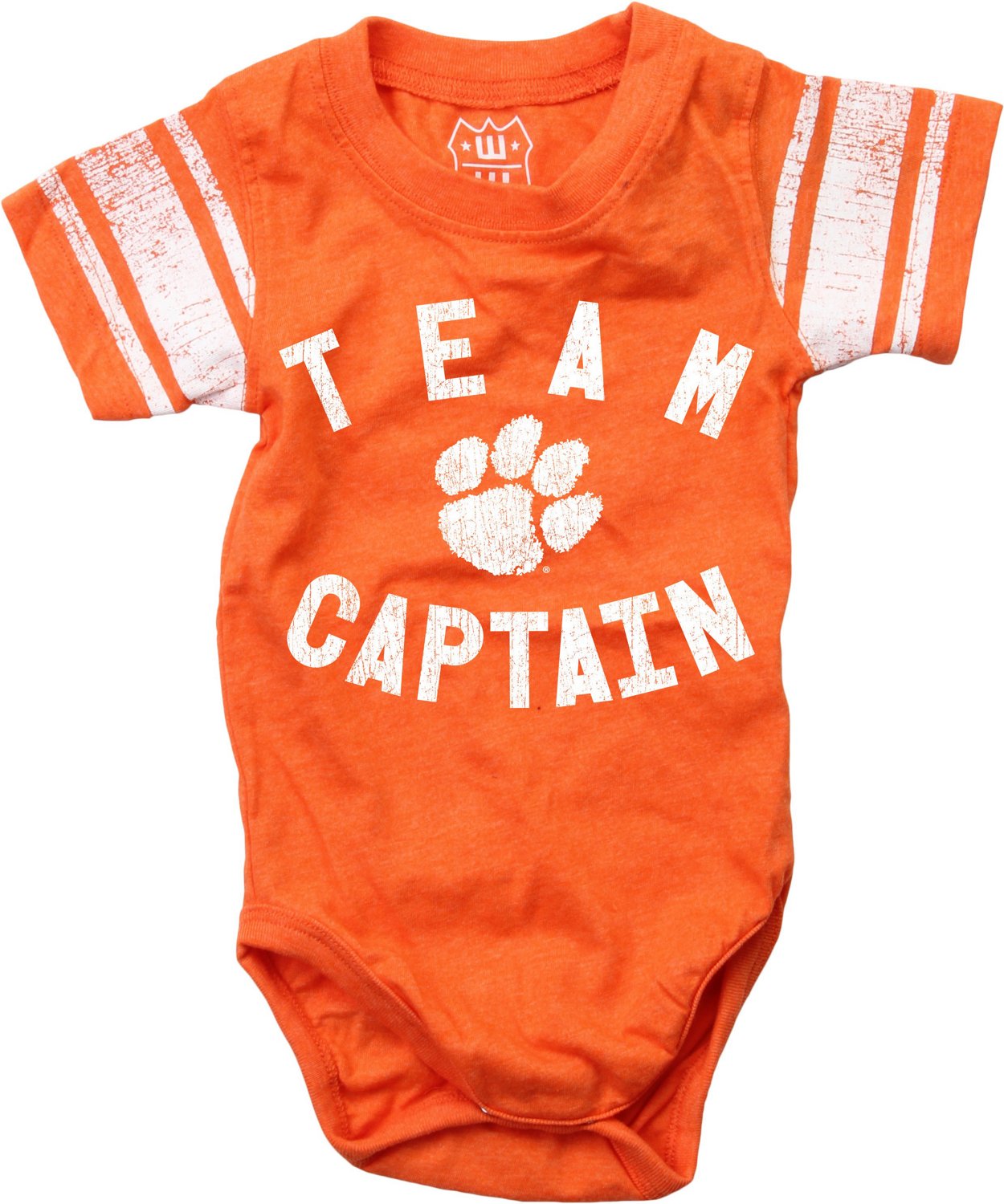 Help your little one show team pride with the Wes and Willy Infants' Clemson University Sleeve Stripe Onesie. This onesie is made from cotton and polyester blend fabric for comfort and softness and has snaps at the bottom for easy on/off. The screen-printed Clemson graphic shows your baby's team spirit.