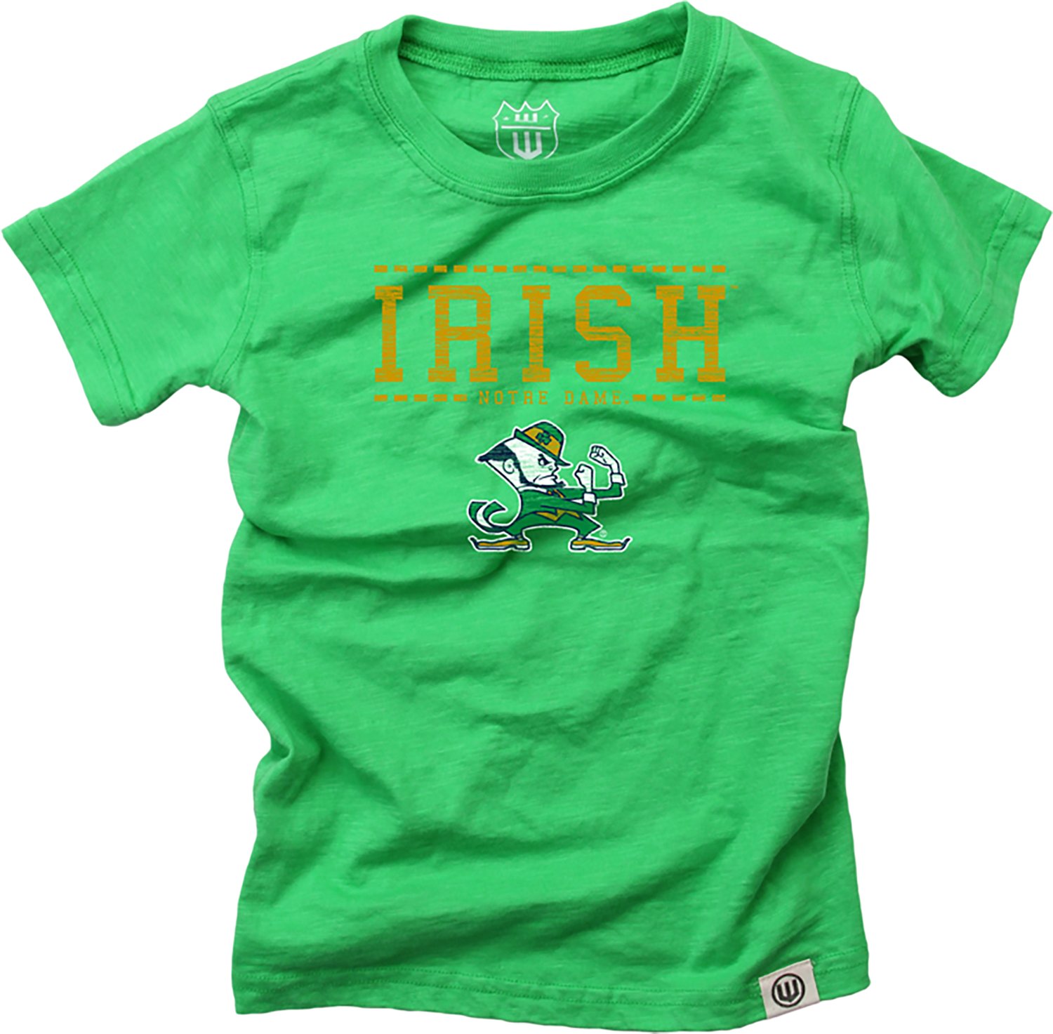 Show your support with the Wes & Willy Girls' Notre Dame Fighting Irish Over Mascot Short Sleeve Graphic T-shirt. The cotton-polyester blend material is comfortable and breathable, and the team-inspired graphics show your fandom with pride.