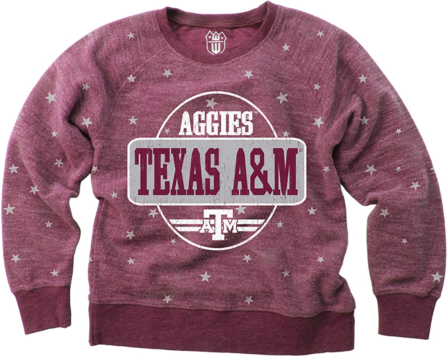 Stay warm while cheering on your team with the Wes & Willy Girls' Texas A&M Shimmer Star Reverse Fleece Crew Sweatshirt. The cotton and polyester construction provides comfort and durability, while the team logo makes it clear you're a dedicated fan.