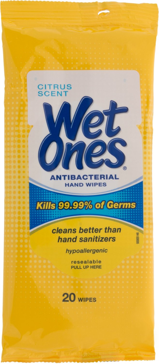 Great for quick, on-the-go cleanups of dirt and messes, the Wet Ones® Citrus Antibacterial Wipes 20-Pack are formulated to kill 99.99% of germs and feature a citrus scent that leaves surfaces smelling clean and fresh. The wipes are hypoallergenic and enriched with aloe to protect against skin irritation.