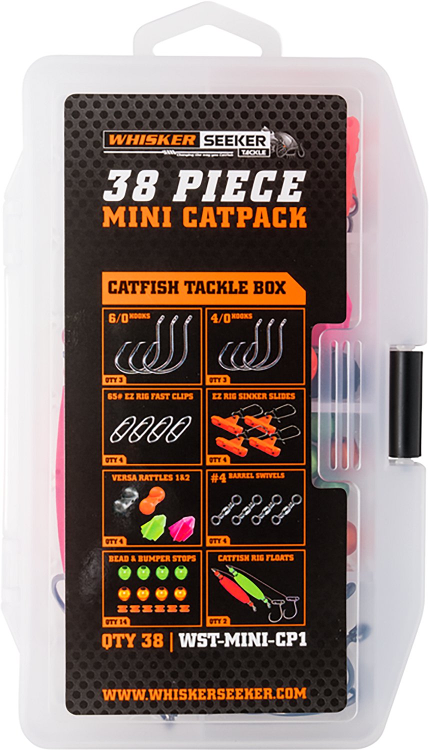 Make sure you have all of the equipment you need to tackle tough catfish by bringing along the Whisker Seeker 38-Piece Mini Catpack Kit. This tackle kit comes with 38 total pieces, including rattles, 4/0 and 6/0 catfish hooks, and more.