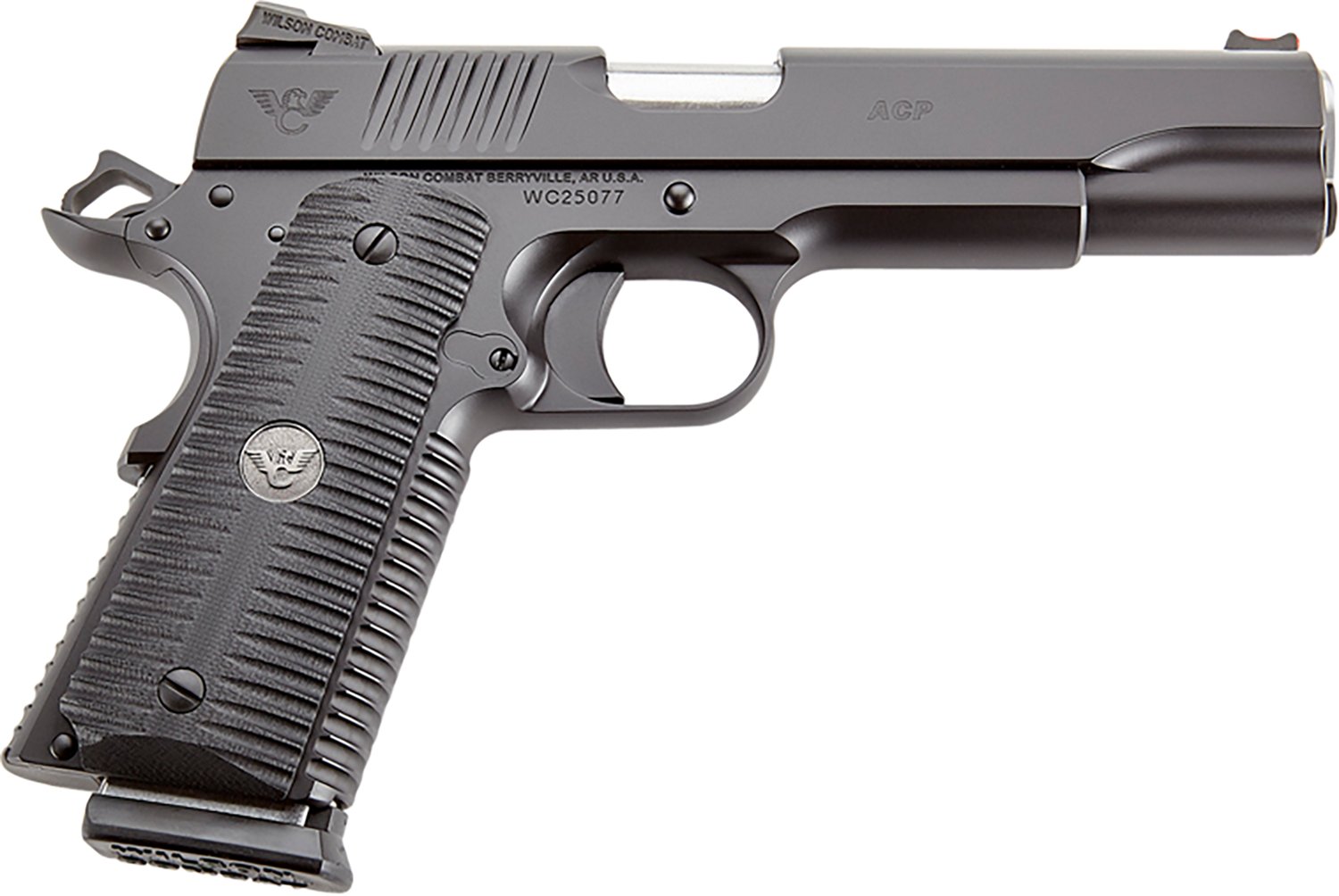 The Wilson Combat ACP Full-Size SAO 9mm Luger Pistol is a single action handgun made of carbon steel with a protective Armor-Tuff finish. It is designed with a beavertail frame and G10 eagle claw grip. It features a manual safety and comes equipped with a rail for accessory mounting.