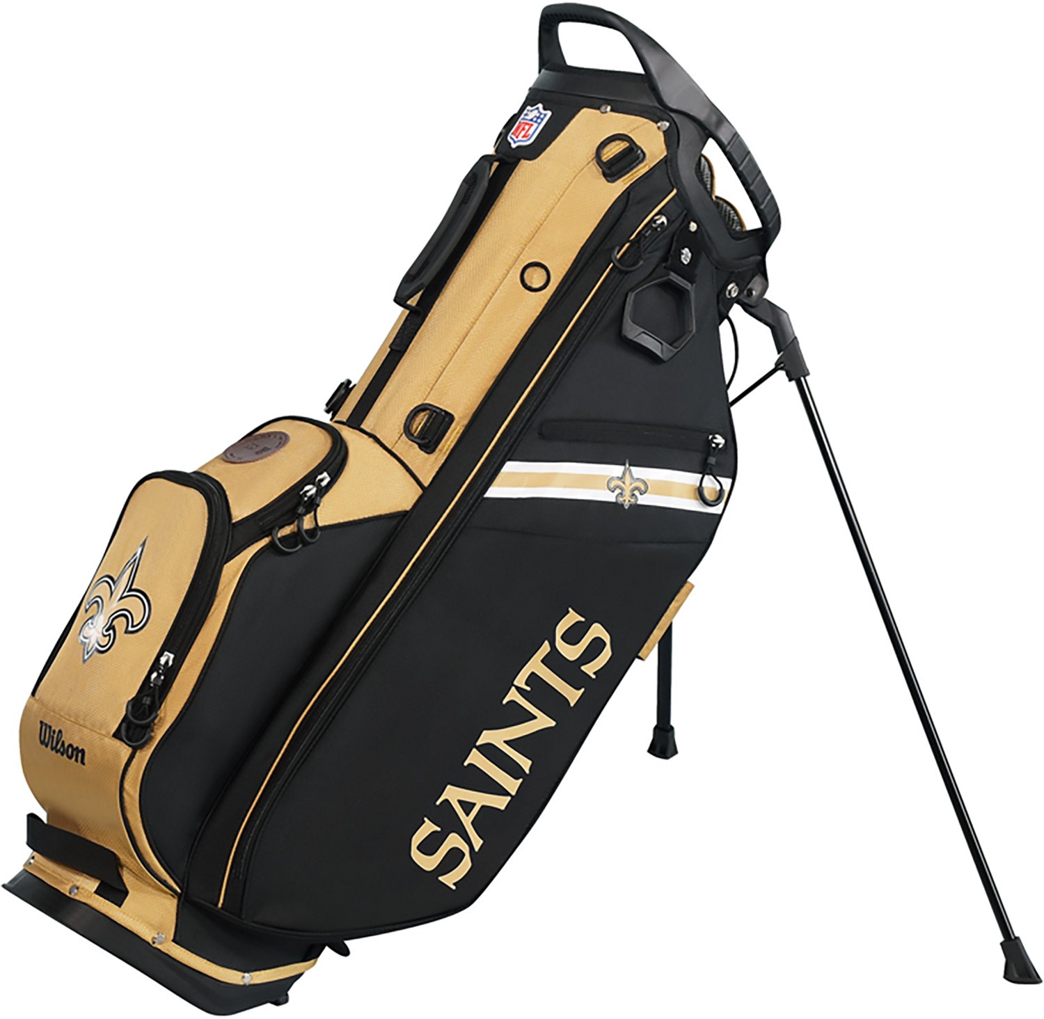 The Wilson Saints Stand Bag lets you carry your colors with confidence. Tee off with your team and bring your fandom to the fairway. As the official provider of the NFL game ball since 1941, Wilson delivers authentic craftsmanship in a stand bag obsessively engineered for performance. Lightweight yet sturdy, this bag features a magnetic GPS pocket, integrated beverage pocket, ergonomic double shoulder straps, and quick-activation legs for easy carrying and setup. Finished with premium NFL logos, team-approved colors, and a unique leather commemorative pouch, it’s built for golfers who want tour-ready function with unmistakable team pride.