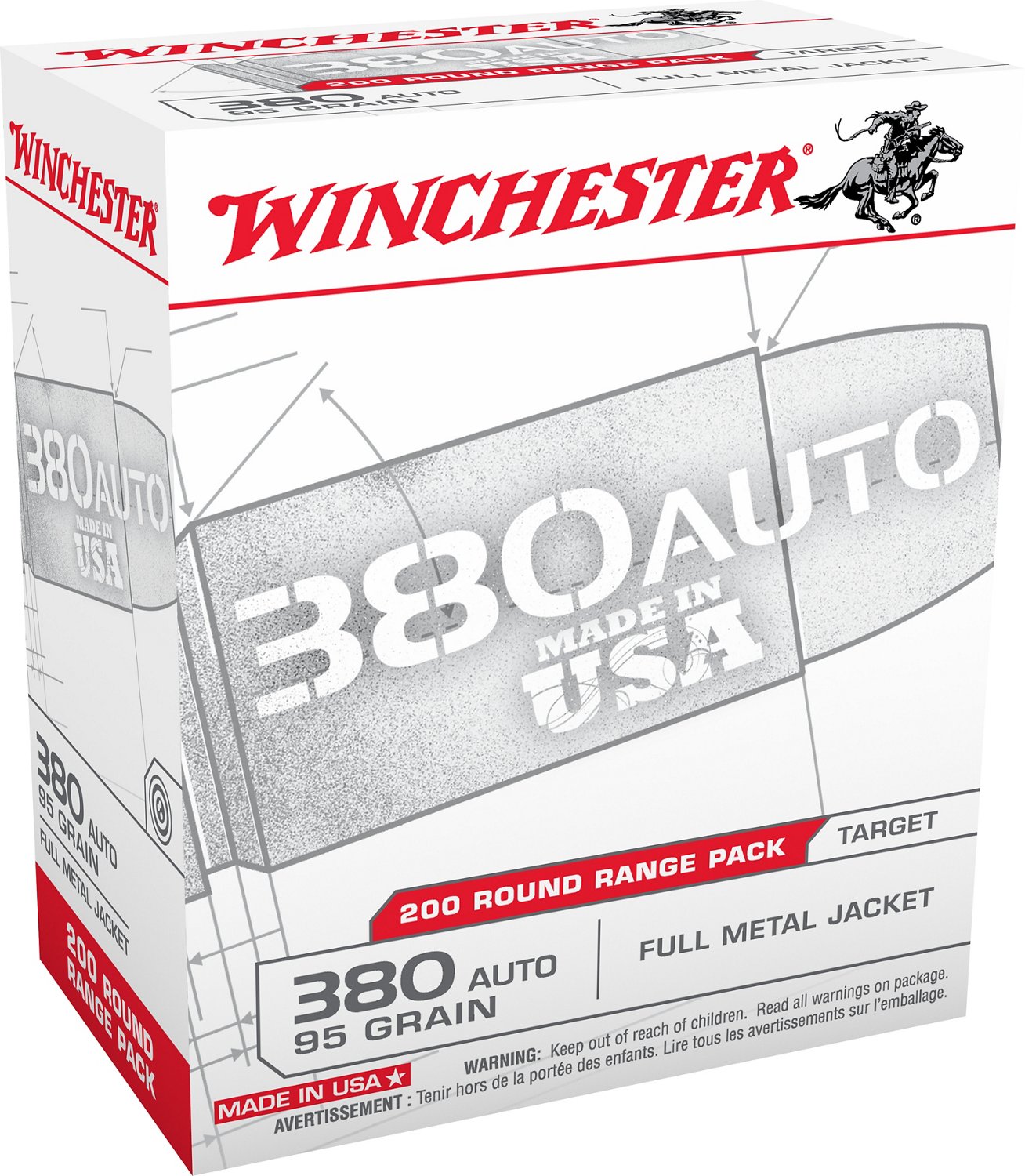 Practice your target-shooting skills with the Winchester .380 Automatic 95-Grain FMJ Centerfire Pistol Ammunition, which has full-metal jacketed bullets and is designed to offer consistent accuracy. 200-round box. Made in USA.