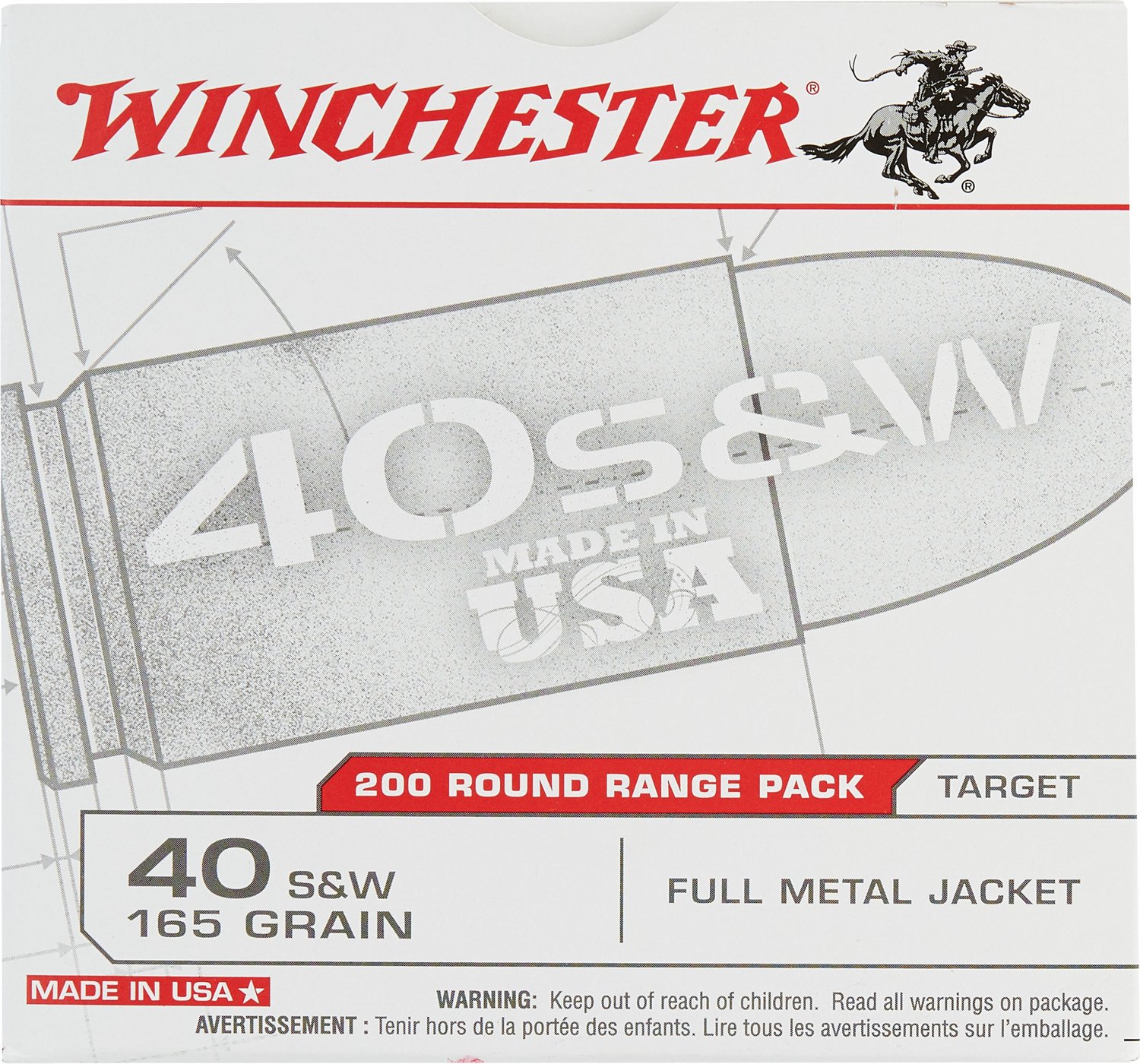 The Winchester .40 S&W 165-Grain FMJ Centerfire Pistol Ammunition - 200 Rounds is a great choice for target practice. This ammunition has a full metal jacket. The .40 S&W caliber and 165-grain weight provide reliable performance and moderate recoil. The 200-round box offers convenience and value for frequent shooters.