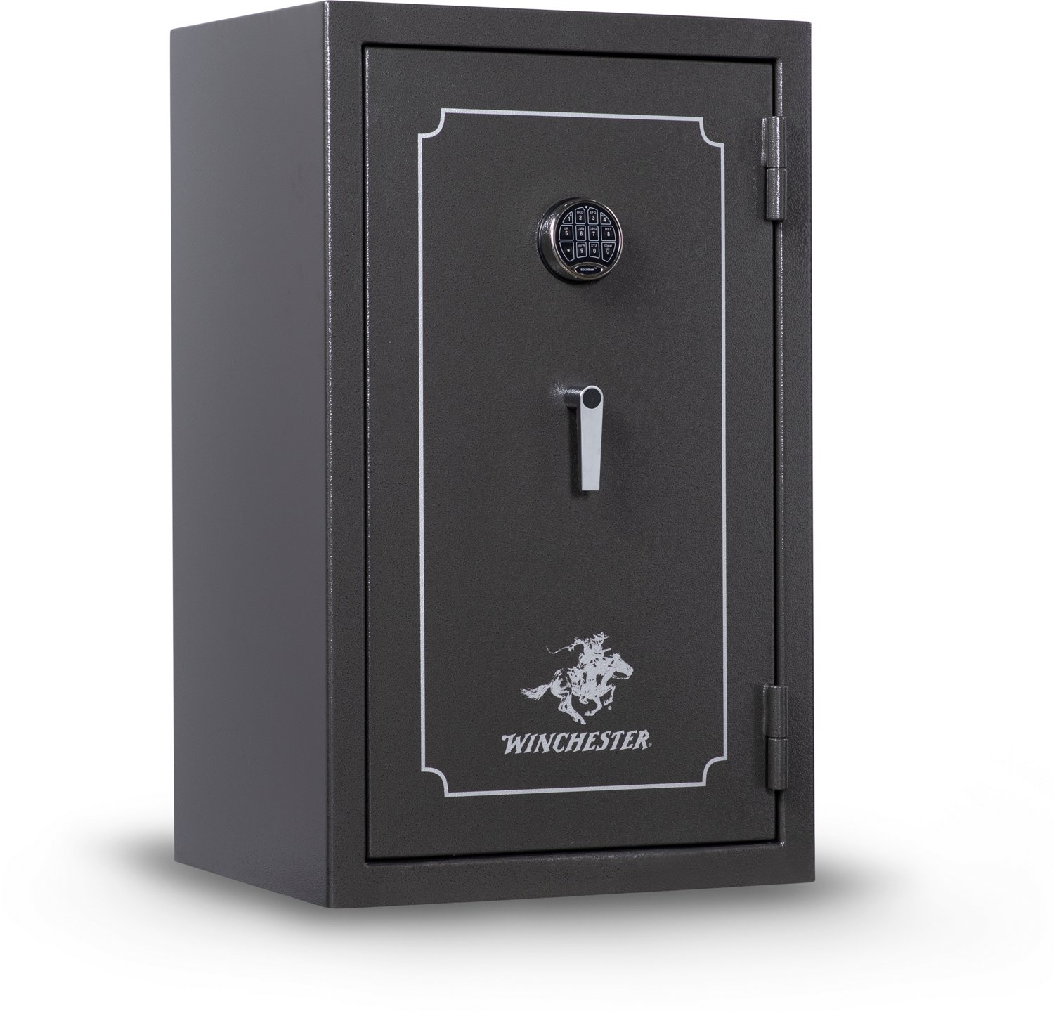 Keep your collection safe and secure with the Winchester Home 12 2-Gun Safe. The 14 gauge steel construction affords durability, while fireboard protection in the ceiling, walls and door provides up to 45 minutes of fire protection at 1,400 degrees Fahrenheit. Internally, the safe can hold up to 2 handguns at a time, with additional shelves and pockets for ample storage space.