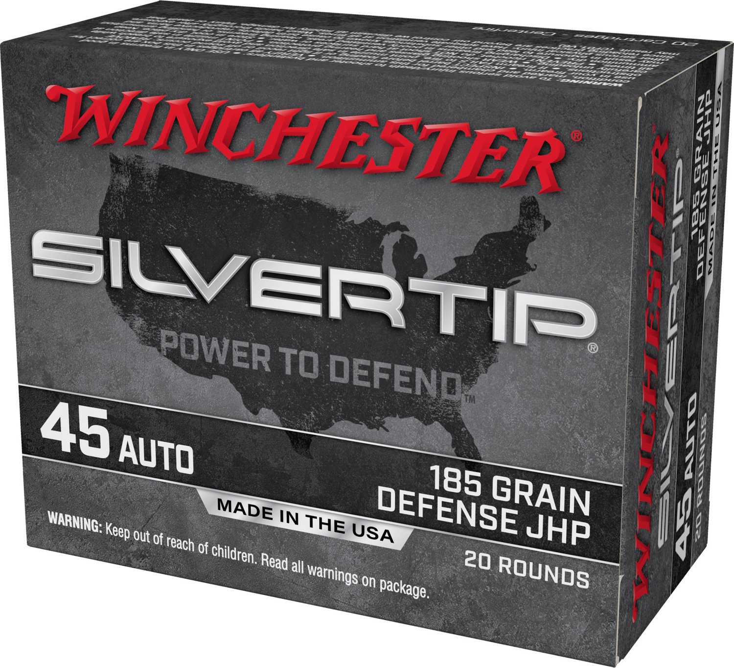 Design with precision in mind, these Winchester Silvertip .45 ACP 185-Grain Centerfire Rifle Ammunition are ideal for home defense. This ammunition features an engineered jacket profile and silver-tip, hollow-point (STHP) construction. 20-round box. Made in USA.