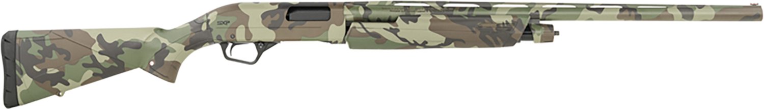 Arm yourself with the Winchester SXP Waterfowl Hunter 12 Gauge Pump Action Shotgun. It is pump action with a 4-round capacity. The barrel with a Woodland Camo finish is 28-inches long, and its camo stock is equipped with a Woodland Camo finish. The aluminum alloy receiver finishes off the design.