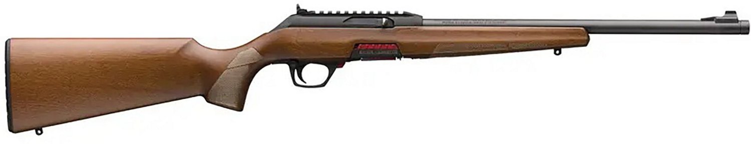The Winchester Wildcat Sporter .22 LR 16.5 in Semiautomatic Rifle is a rimfire rifle featuring a blued, threaded barrel and a satin hardwood stock. The manual safety and magazine release are ambidextrous, and the receiver is drilled and tapped. The firearm also boasts adjustable sights and an integrated Picatinny rail.
