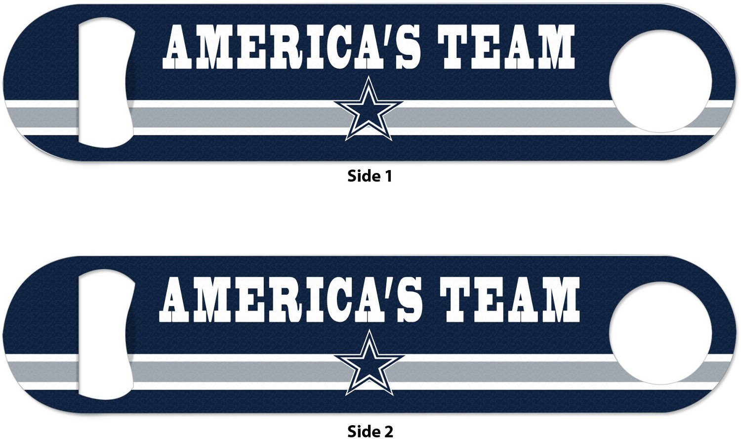 Crack open your favorite beverage on game day with the WinCraft Dallas Cowboys Metal Bottle Opener Tool. Constructed with durable metal, this tool features a two-sided design with a heavy-duty bottle opener on one side and a round can tab opener on the other for versatility. The printed Cowboys name and logo show off your team spirit.