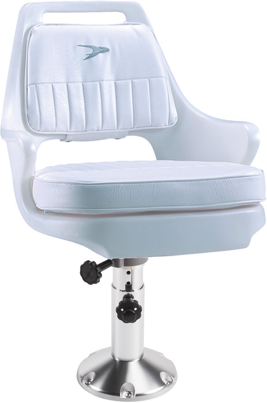 Equip your boat with the Wise Pilot Helm Chair with Adjustable Pedestal. It rotates 360 degrees and adjusts in height atop the sturdy base to help you find a comfortable sailing position. Embossed and embroidered, the snap-on cushions are foam padded for comfort and upholstered in long-lasting vinyl that guards against mildew and UV damage.