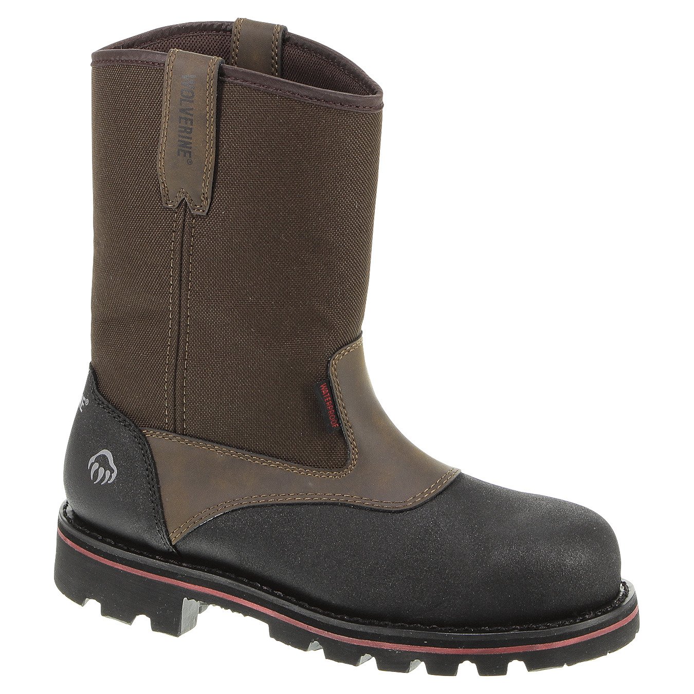 The Wolverine Men's Drillbit Oil Rigger Steel-Toe EH Wellington Work Boots feature waterproof leather uppers for durability and OrthoLite footbeds that offer cushioned comfort. Vibram rubber lug outsoles deliver traction, while wave mesh with PC Dry linings provide breathability and help wick away sweat. Meets ASTM F2413-11 M I/75 C/75 standards. Pull-on style. Goodyear welt construction.