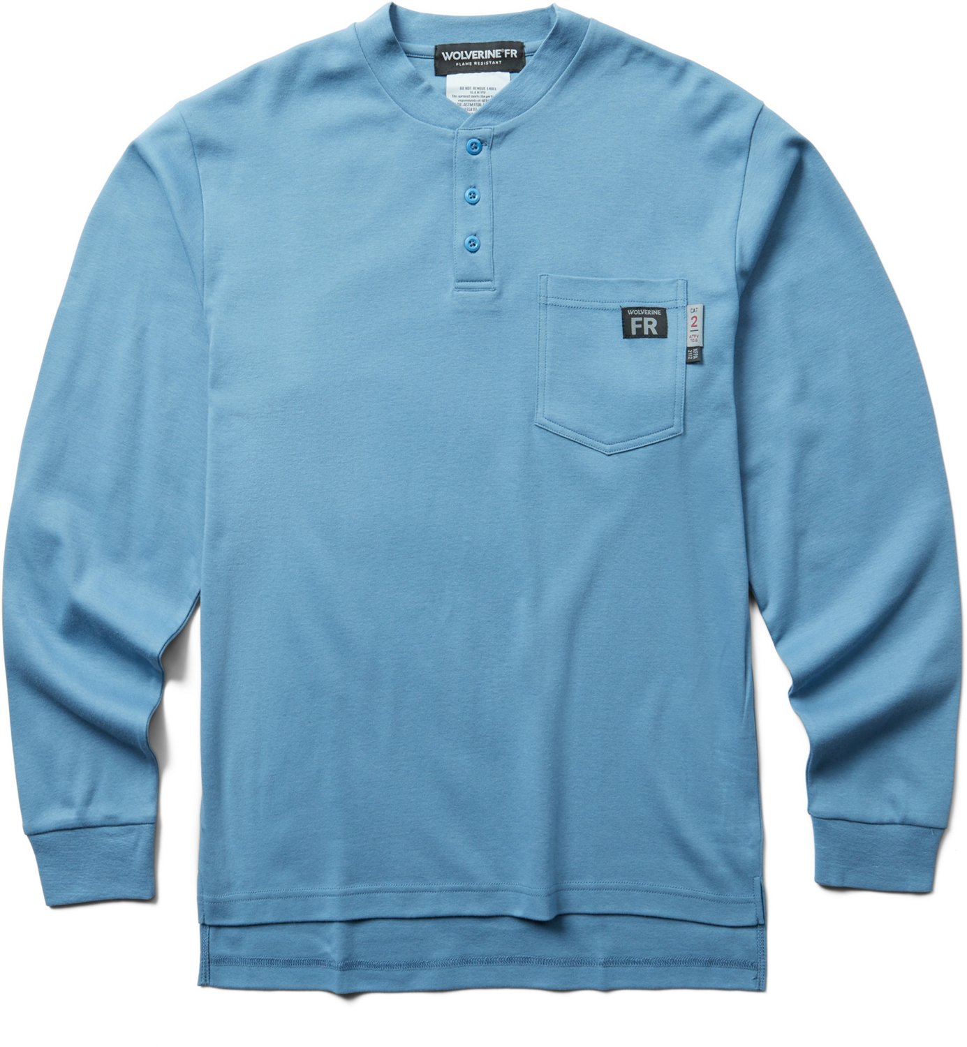 Great for work or casual wear, the Wolverine Men's Flame Resistant Long Sleeve Henley is made of 100% cotton interlock knit for a soft feel and comfortable wear and features a 3-button placket with flame-resistant plastic buttons. Flame-resistant ribbed cuffs and collar. Extended tail for full coverage. Chest pocket with the FR logo.