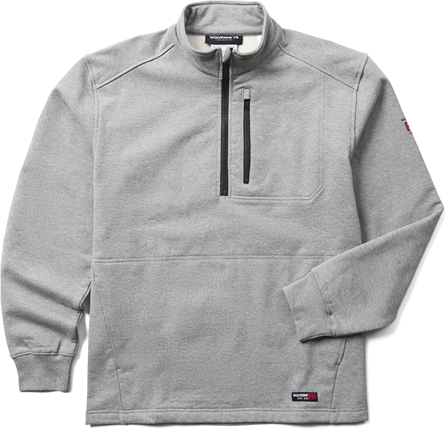 Look your best when you wear the Wolverine Men's FR Fleece 1/4-Zip Sweatshirt. It is made of 95% cotton and 5% spandex. The 1/4-zip creates an adjustable neckline, and its fabric resists wind to keep you warm. The Wolverine FR logo graphic finishes off the design.