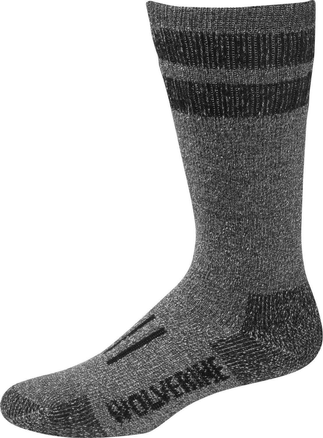 Sport the Wolverine Men's Hunter Wool OTC Boot Socks 2 Pack for a long-lasting soft and cozy treat for your feet. The Merino thermal wool, moisture-wicking fabric with a full-cushion design offers a dry, warm and comfortable feel, while the odor-resistant technology fights odors for a fresh scent.