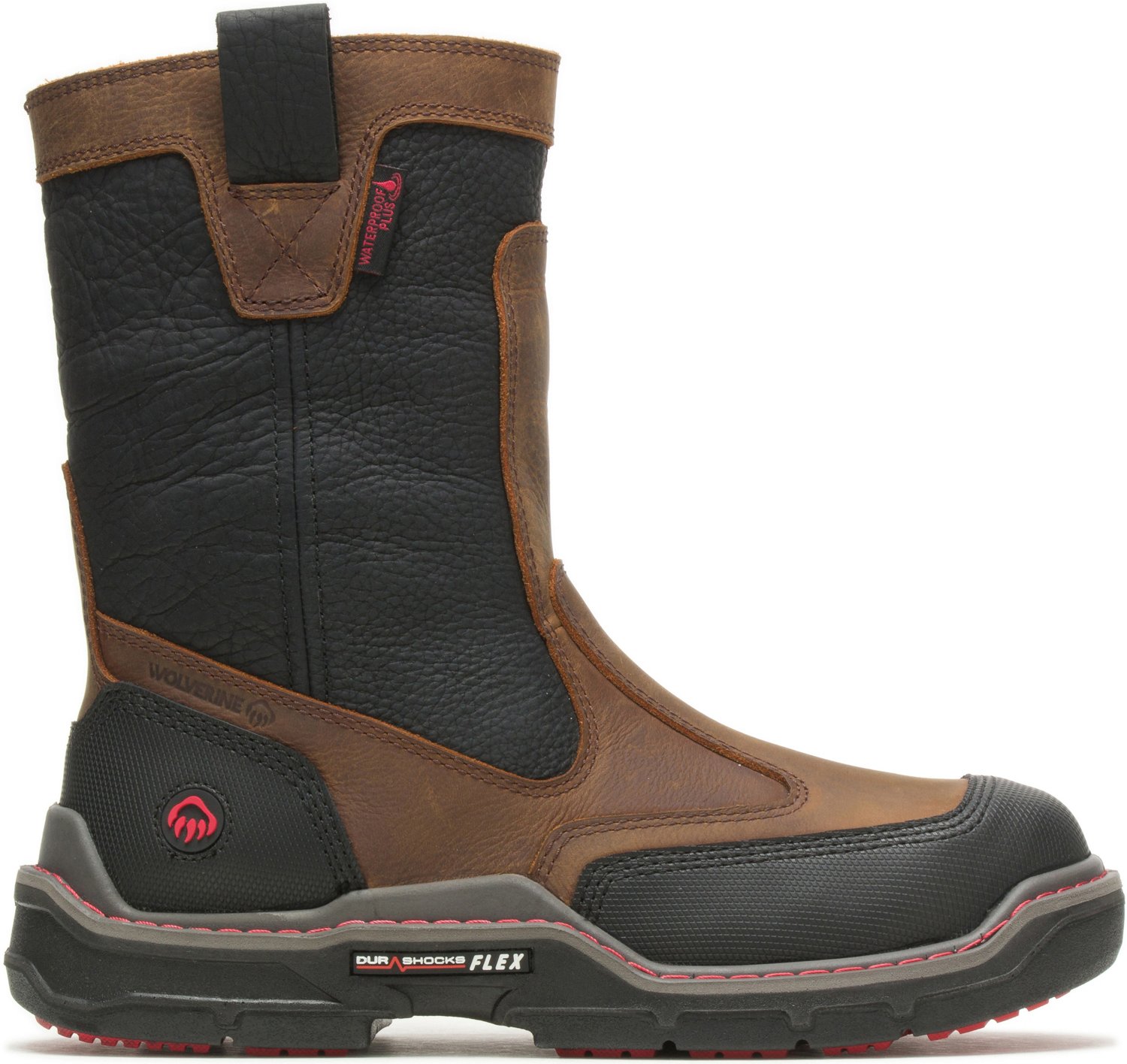 Step onto the job with confidence whenever you slip on the Wolverine Men's Raider Heavy Duty Overman Composite Toe Work Boots. Crafted with a Durashock Flex construction, these work boots boast leather uppers for durability and style and feature a wellington style for convenient on and off. The Carbonmax composite toes supply protection, while the waterproof finish helps keep your feet dry and comfortable throughout the work day.